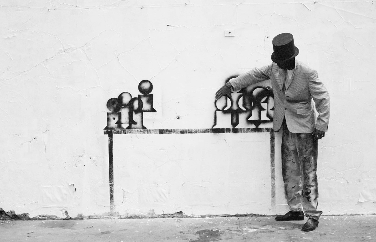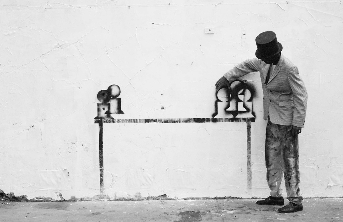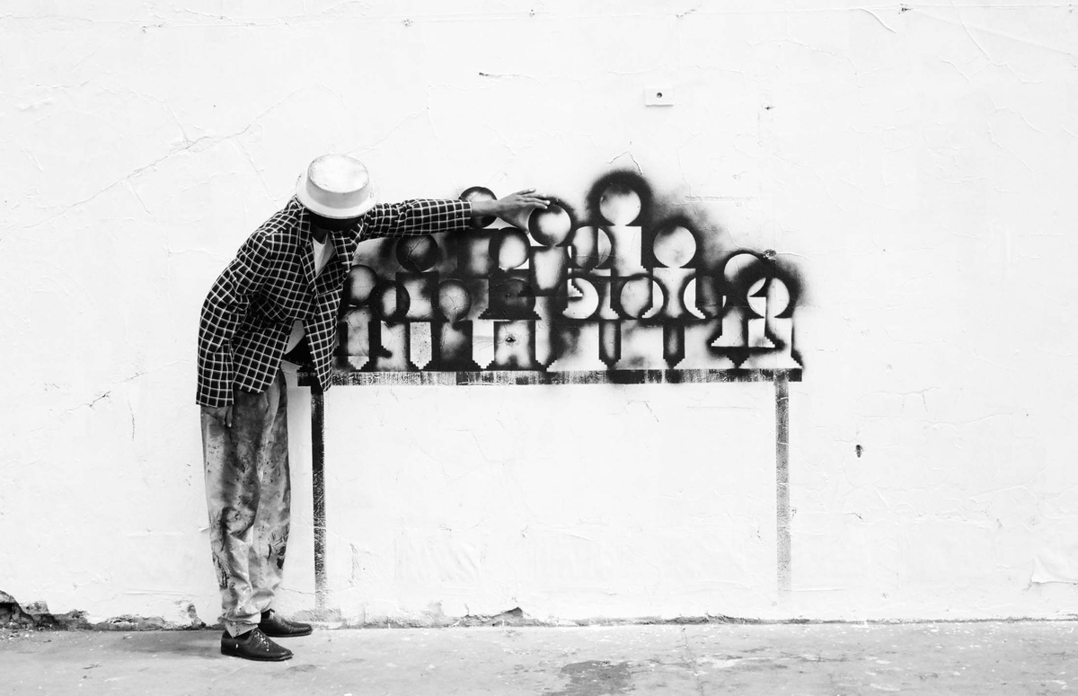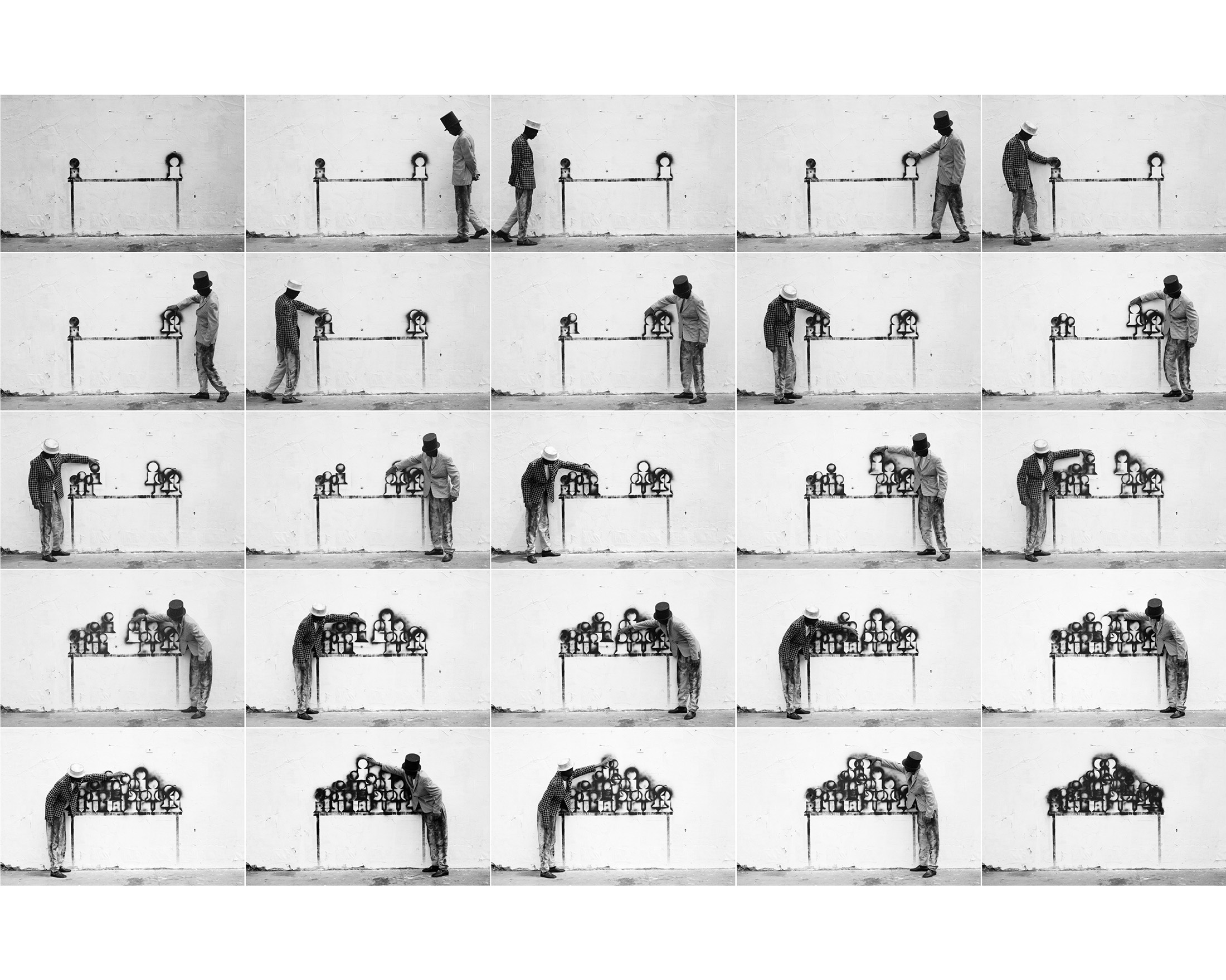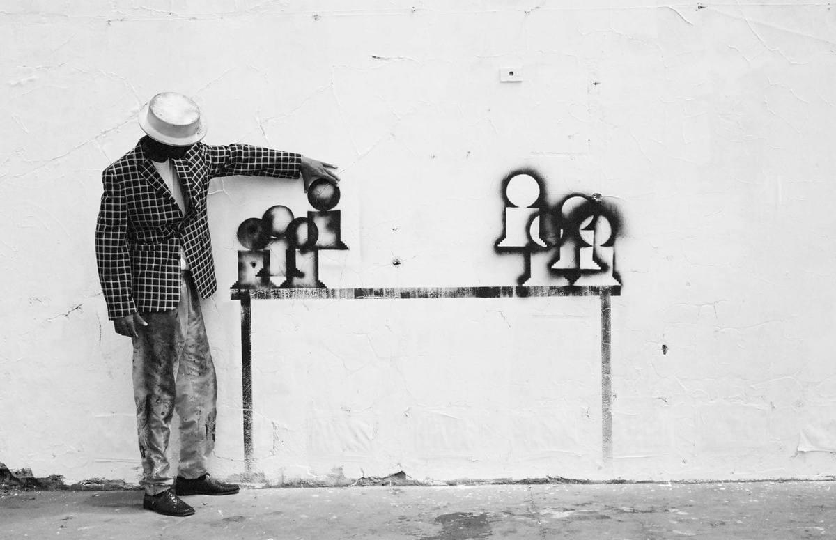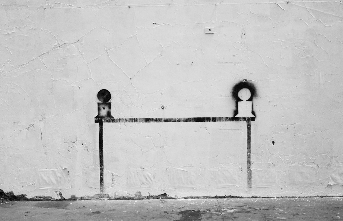 In all Robin Rhode’s work, line is primary – as formal device, as progression, as narrative structure. With the simplest propositions, he gives expression to imagined scenes. His work more often persists as document, the original offering only transitory. In charcoal, chalk and paint, Rhode creates sites of engagement within the city. The sidewalk becomes stage; an actor, always anonymous, appears. A series of photographs are taken, a stop-frame animation is made. Performance, drawing, photograph – the resulting works are all these mediums distilled to image, be it static or moving. The scene is later painted over; the actor departs; the set returns to inner-city wall. Largely produced in Rhode’s native Johannesburg, the works’ political implications are apparent, touching on such issues as urban poverty and violence, street culture and its aspirations. Rhode, however, considers himself more a formalist than social messenger, an artist concerned with mimesis – with art’s illusion – and the many tensions between image and object; the two-dimensional and the three-dimensional, represented and real. This is particularly true of his more recent work, which pairs both colour theory and geometry with the performing body.