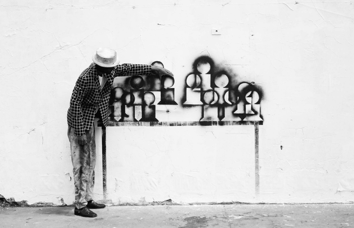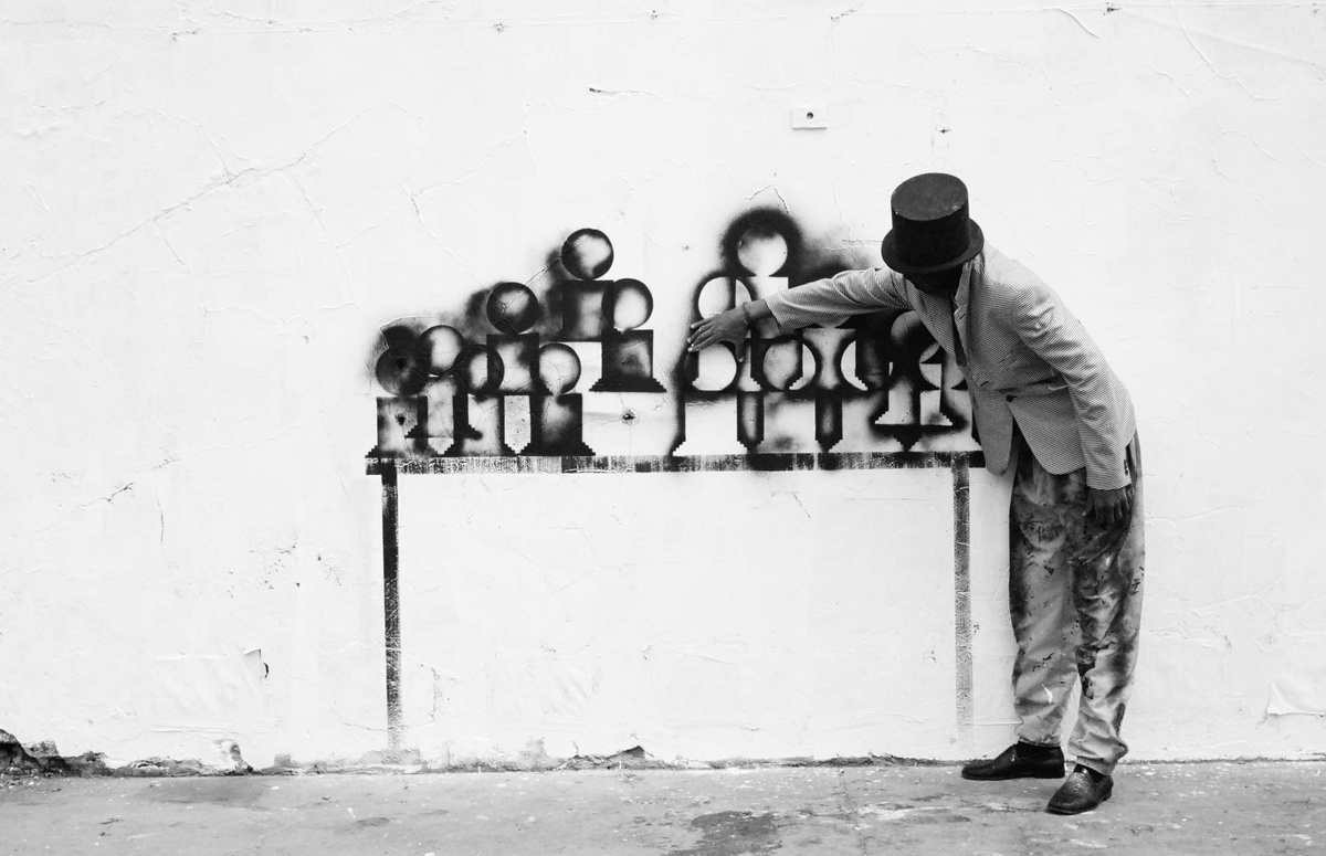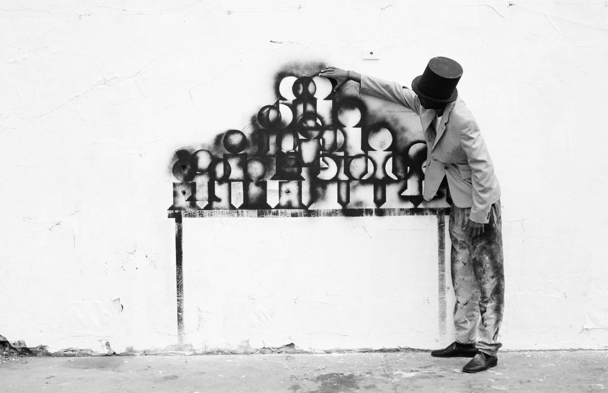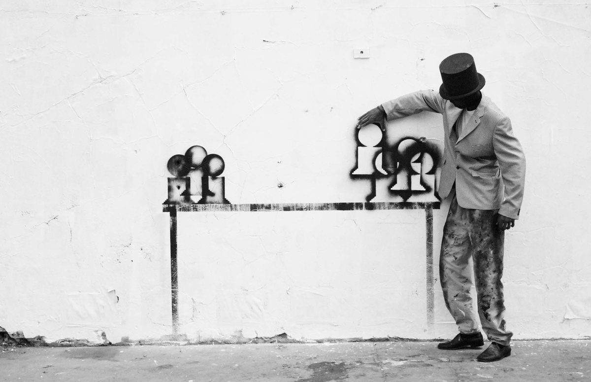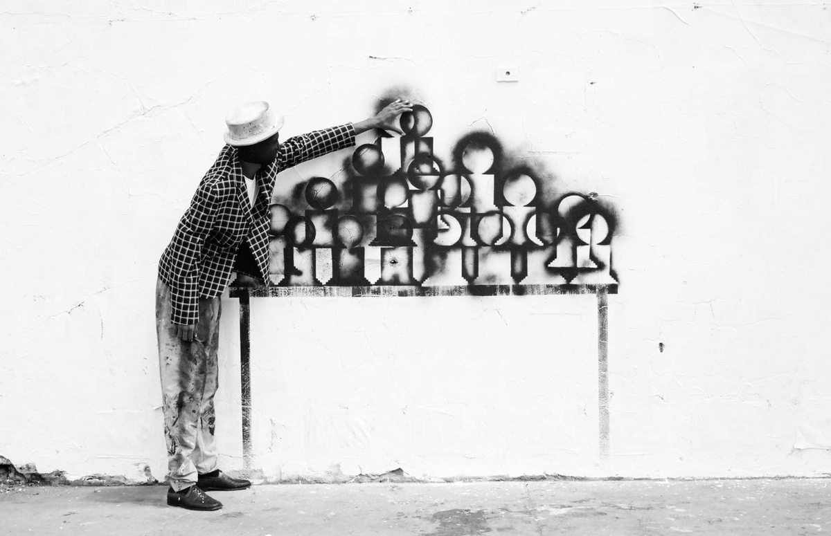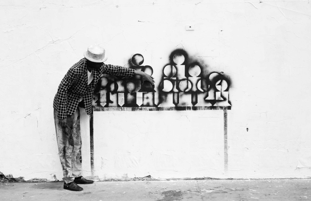 In all Robin Rhode’s work, line is primary – as formal device, as progression, as narrative structure. With the simplest propositions, he gives expression to imagined scenes. His work more often persists as document, the original offering only transitory. In charcoal, chalk and paint, Rhode creates sites of engagement within the city. The sidewalk becomes stage; an actor, always anonymous, appears. A series of photographs are taken, a stop-frame animation is made. Performance, drawing, photograph – the resulting works are all these mediums distilled to image, be it static or moving. The scene is later painted over; the actor departs; the set returns to inner-city wall. Largely produced in Rhode’s native Johannesburg, the works’ political implications are apparent, touching on such issues as urban poverty and violence, street culture and its aspirations. Rhode, however, considers himself more a formalist than social messenger, an artist concerned with mimesis – with art’s illusion – and the many tensions between image and object; the two-dimensional and the three-dimensional, represented and real. This is particularly true of his more recent work, which pairs both colour theory and geometry with the performing body.