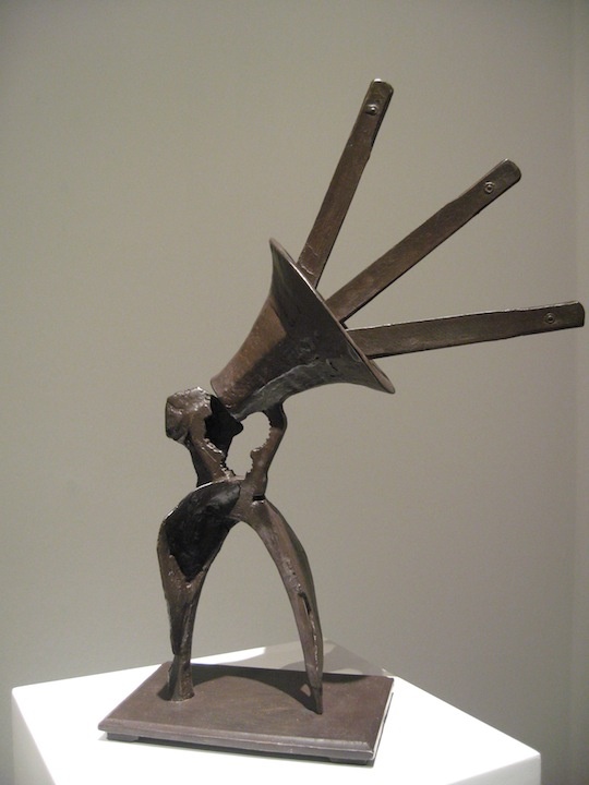 Made from pliers and other found objects arranged together and later cast in bronze, Kentridge’s Megaphone conveys his catholic interests. There is a deft nod to the collages and cut-ups of Dada, another to Duchamp’s ready-mades, a third to Russian Constructivism, and the last to Soviet Agitprop. The resulting ensemble – both objects and influences – implies a propagandist of obscure authority. The message broadcast is no doubt nonsensical (think only of Hugo Ball and the Dada poets with their 'sound poems'). Besides, what could the pliers have to say to the people? And if not the people, the other household hardware? Cast off the shackles of utility, or gaga di bling blong, gaga blung?