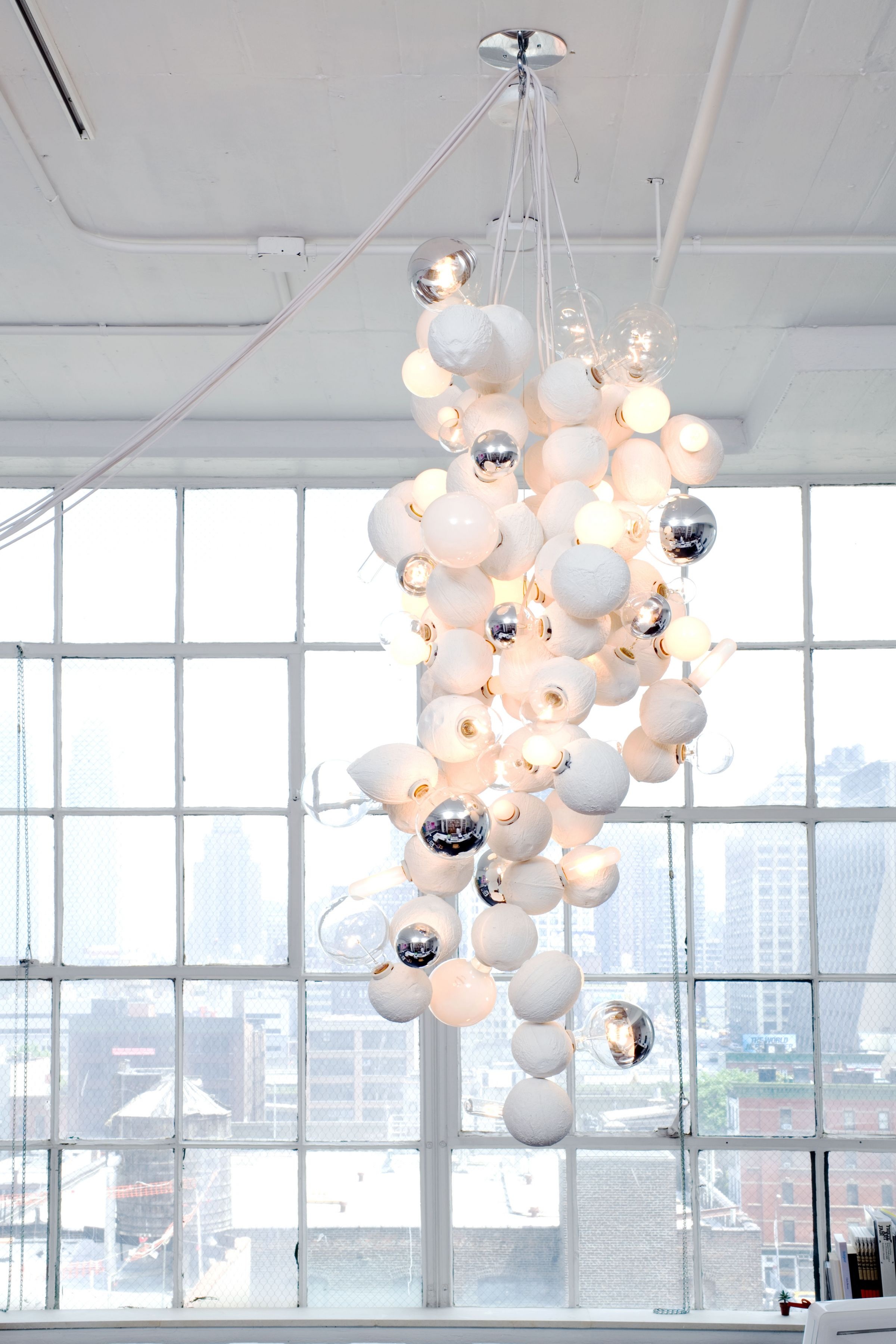 Untitled is a more muted offering from Guyton/Walker, the collaborative twosome better known for their glaringly bright palette and compositional chaos. A jumbled chandelier of bare lightbulbs, plaster-cast coconuts, and glass globes, the work is all but drained of the duo's colours. It is not, however, without their entropy. Suspended by exposed wiring and hung in haphazard arrangement, the work has about it an implicit threat, intended or otherwise. One needn’t be reminded of the fatal impact of a falling coconut, let alone a glass globe. Formally, Untitled continues Guyton/Walker’s preoccupation with the repetition of shapes and polka dots – the coconut a pictorial device that connects more abstract pursuits to their theme of fruit bowl.