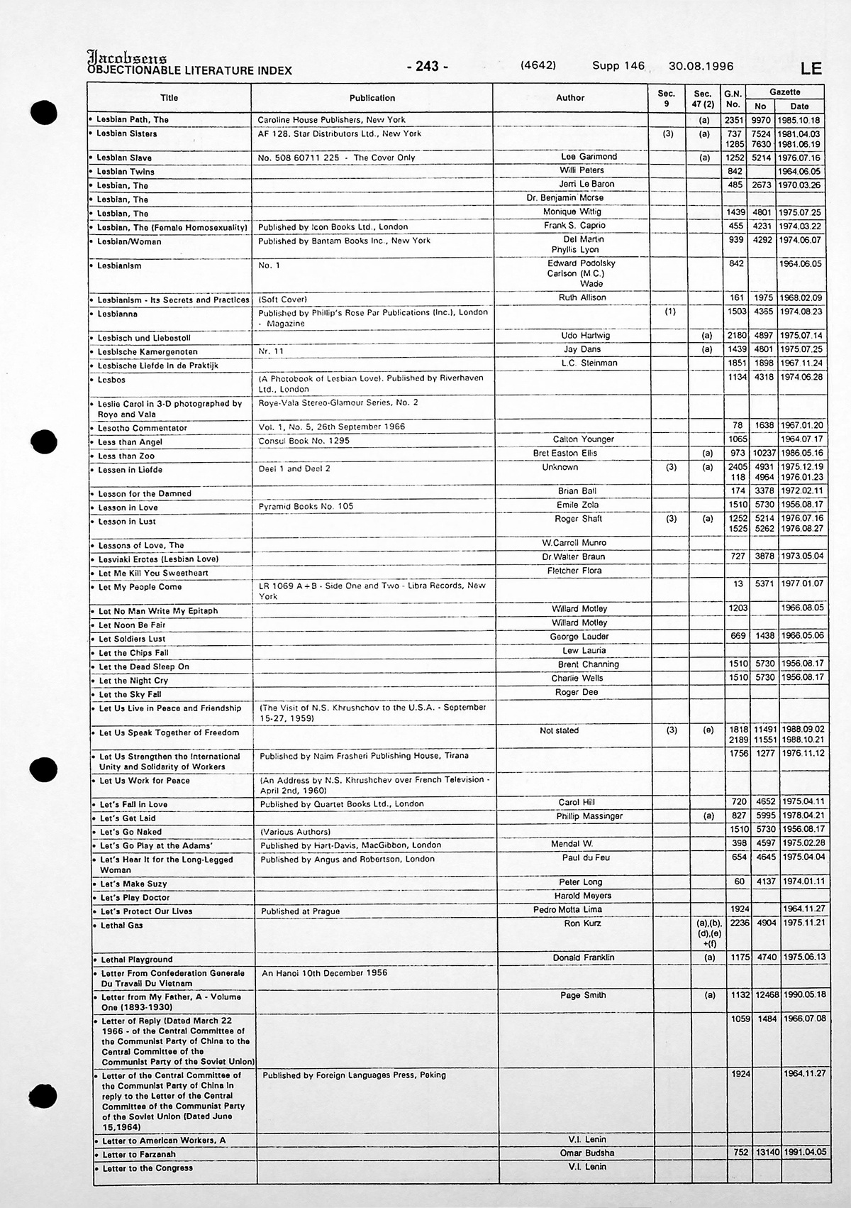 An unofficial, loose-leafed publication, the "Jacobsens" Index listed printed matter banned each month in accordance with the apartheid-era Government Gazette. It was used primarily by librarians and booksellers to ensure no illicit materials made it onto their bookshelves. Those books found guilty of "offensive intermingling", "loose morals" and "subversive propaganda", while removed from public circulation, found unlikely company in the pages of "Jacobsens", from anti-apartheid flyers to a manual on Czechoslovakian sewerage systems. "It was, in a sense, the Book of Books, whose word is set up against that of others,” said Nadine Gordimer, describing it as the "bible of censorship in South Africa.” Photographers listed in the Index include Ernest Cole, Omar Badsha, Peter Magubane, and Eli Weinberg, all represented in the exhibition Photo book! Photo-book! Photobook! at A4, in which this publication was featured.