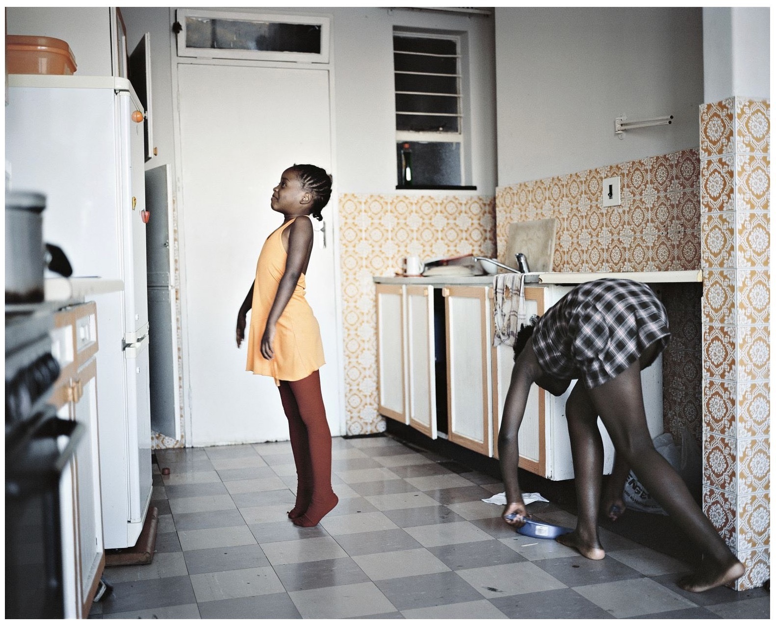 While Mikhael Subotzky and Patrick Waterhouse’s photographic engagement with Ponte City was largely premised on seriality and repetition as a formal device towards a social portrait of the building – the pair cataloguing each window, door, and television in the highrise – the more incidental images included in the project serve to illuminate the lives of its individual residents. Among them is this untitled photograph, picturing a young child on tiptoes in a sunny orange dress, who beams with delight as an older girl sweeps the floor behind her. During the course of their project, Subotzky and Waterhouse came to know several of the building’s resident children; a changing, transient cast that precluded any lasting connections or continuity. Few families stayed long in the tower. This playful, unremarkable moment stands as a counterpoint to the dominant narrative of Ponte as a site of decay or danger. Children make do; fun will be found; a game is always at hand. Joy and resilience persist within a structure so often viewed from a distance and in disdain: a feature of the skyline, an emblem of municipal ineptitude. Seldom home; never refuge. Into this photograph are folded all such contradictions of place.