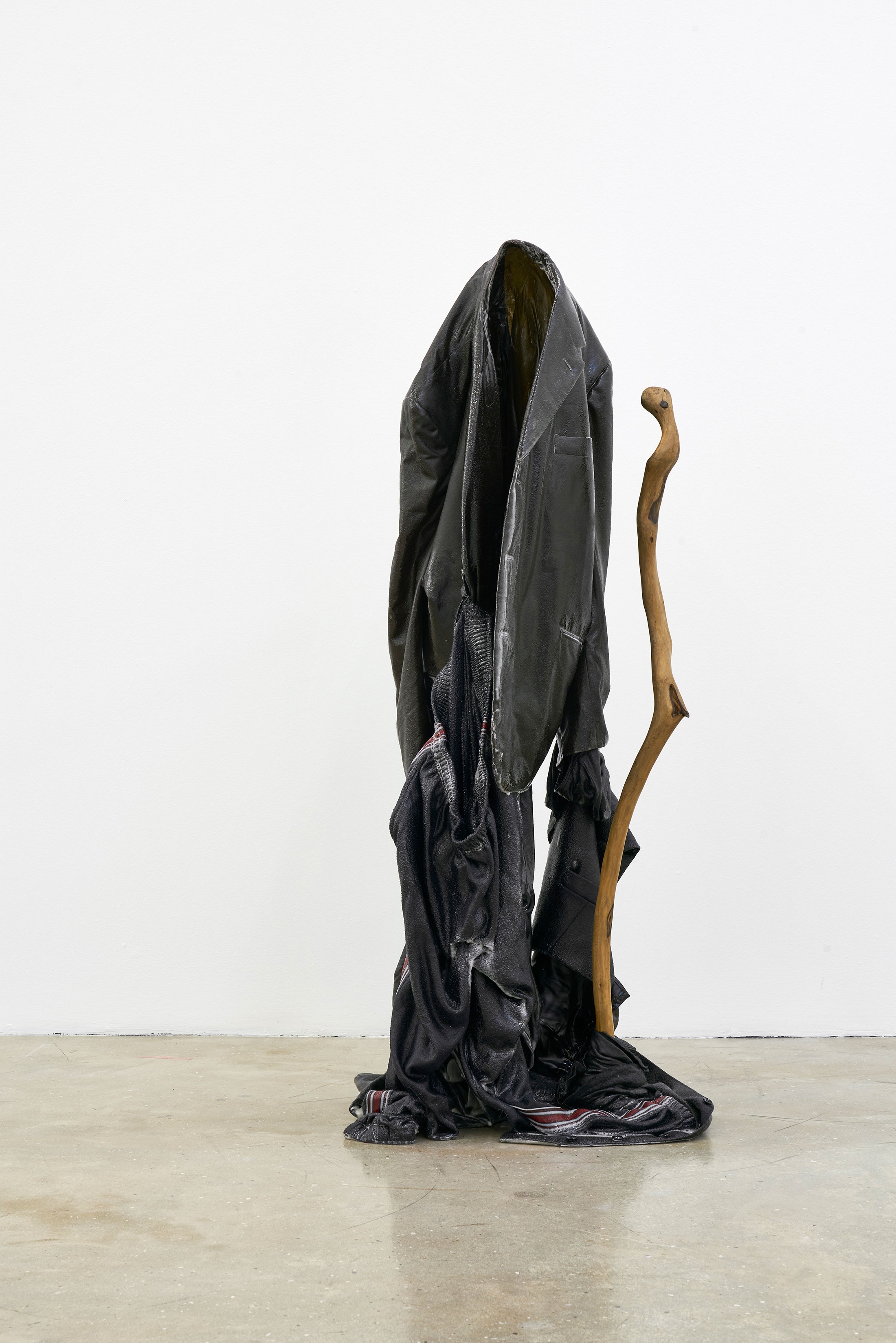 Artwork: Kevin Beasley, Walker (2020). ‘Aid-to-trade’ garments, Congolese walking stick, resin. Private collection.