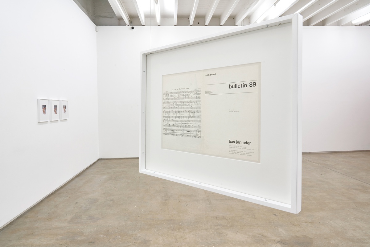 Bas Jan Ader’s foundational works centre on a single verb: to fall. Following his relocation to America’s West Coast, the Dutch-born artist fell in with Los Angeles’ Conceptual art scene of the 1970s alongside the likes of Chris Burden and Jack Goldstein, with whom he shared a proclivity for precarious performances. The ‘fall’ works, which came to define his short career, distil Alder’s dedication to gestural simplicity, of action pursued to its logical limits. The artist falls from a roof, from his bicycle, from a tree branch hanging above a river – the performances compelling for the commitment with which the artist resigns his body to gravity’s pull. While parallels are often drawn between these performances and Buster Keaton’s deadpan acts, any humour in the ‘fall’ works is largely eclipsed by the violence of their fulfilment. Similarly opaque in their intentions, his proceeding works, which demonstrated less a fall than a falling apart, appear torn between self-seriousness and irony – the artist sends photographs of himself crying to friends, inscribes pop-song lyrics on pictures of late-night wanderings, proposes a work with the premise: “My body practising having been drowned.” This last has since gained the weight of prophecy. In 1975, Ader was lost at sea. His disappearance coincided with his final performance, the second work in a trilogy called In Search of the Miraculous. In death, Ader has become a modern-day myth: a tragic figure lost in pursuit of the transcendent. Popular imaginings, coloured by this romance, have further obscured the attitude with which his works were first conceived. The story of his death precedes his practice, circumscribing its resonances.