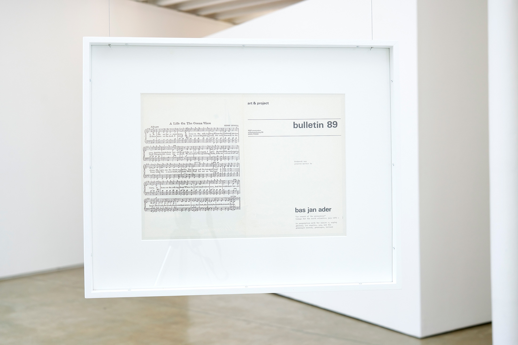 When In Search of the Miraculous (One Night in Los Angeles) was first exhibited, Ader displayed alongside it a bulletin published by Art & Project, an alternative art space in Amsterdam. The publication included the musical notation to a 19th-century sea shanty, A Life on the Ocean Wave (1838) by Epes Sargent and Henry Russell, as well as an image of the artist on a small sailing boat. The exhibition, held at Claire Copley Gallery, LA, was accompanied by a musical performance of seafaring songs. Together, the bulletin and shanties announced the artist’s upcoming gesture, the second in the In Search of the Miraculous series: Ader intended to set sail from Cape Cod, Massachusetts, to Falmouth, England, in a thirteen-foot vessel. The performance would last sixty days; the voyage documented in a logbook and photographs. On July 9, 1975, Ader sailed out into the Atlantic. His wife, Mary Sue Ader Andersen, photographed the artist as his boat was towed out from the harbour. Three weeks later, radio contact onboard Ocean Wave was lost. On April 16, 1976, the crew of a Spanish fishing trawler found Ocean Wave, bow submerged, the boat unmanned. That he disappeared in his search, rather than diminish the work’s success, has affirmed its lasting intrigue; the lone figure of the artist set adrift at sea.