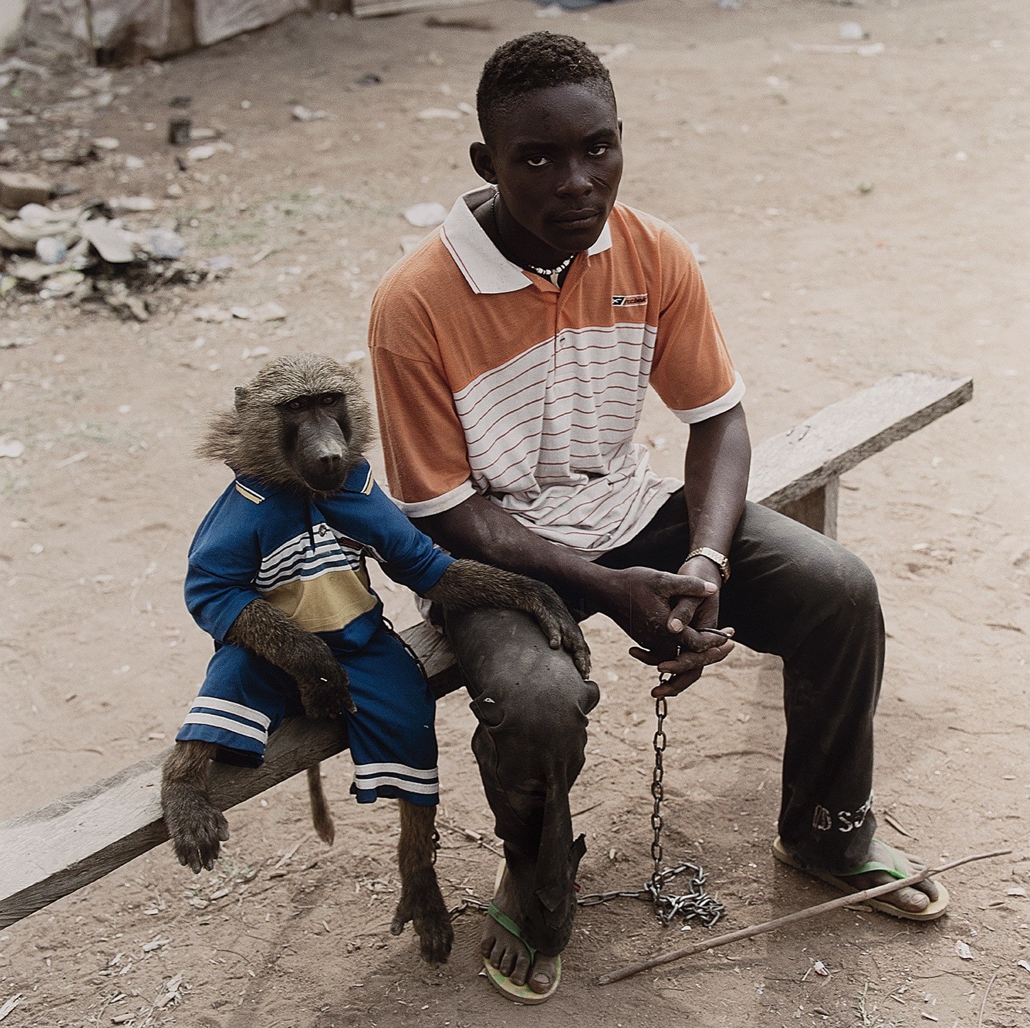 Dayaba Usman with the monkey Clear is included in The Hyena and Other Men, a photographic essay that documents the Gadawan Kura, an itinerant family of traditional healers and entertainers, together with the wild animals they use to promote their herbal (and more often magical) remedies. Many myths surround these performers, as do the spells and incantations which protect them from the harm necessary to their trade. At once exotic and strange, the photographs are intimate portraits of people and captive animals. “What I found fascinating,” Hugo said of the series, “was the hybridisation of the urban and the wild, and the paradoxical relationship that the handlers have with their animals – sometimes doting and affectionate, sometimes brutal and cruel… I look back at the notebooks I had kept while with them. The words dominance, co-dependence and submission kept appearing… The motifs that linger are the fraught relationships we have with ourselves, with animals and with nature.”