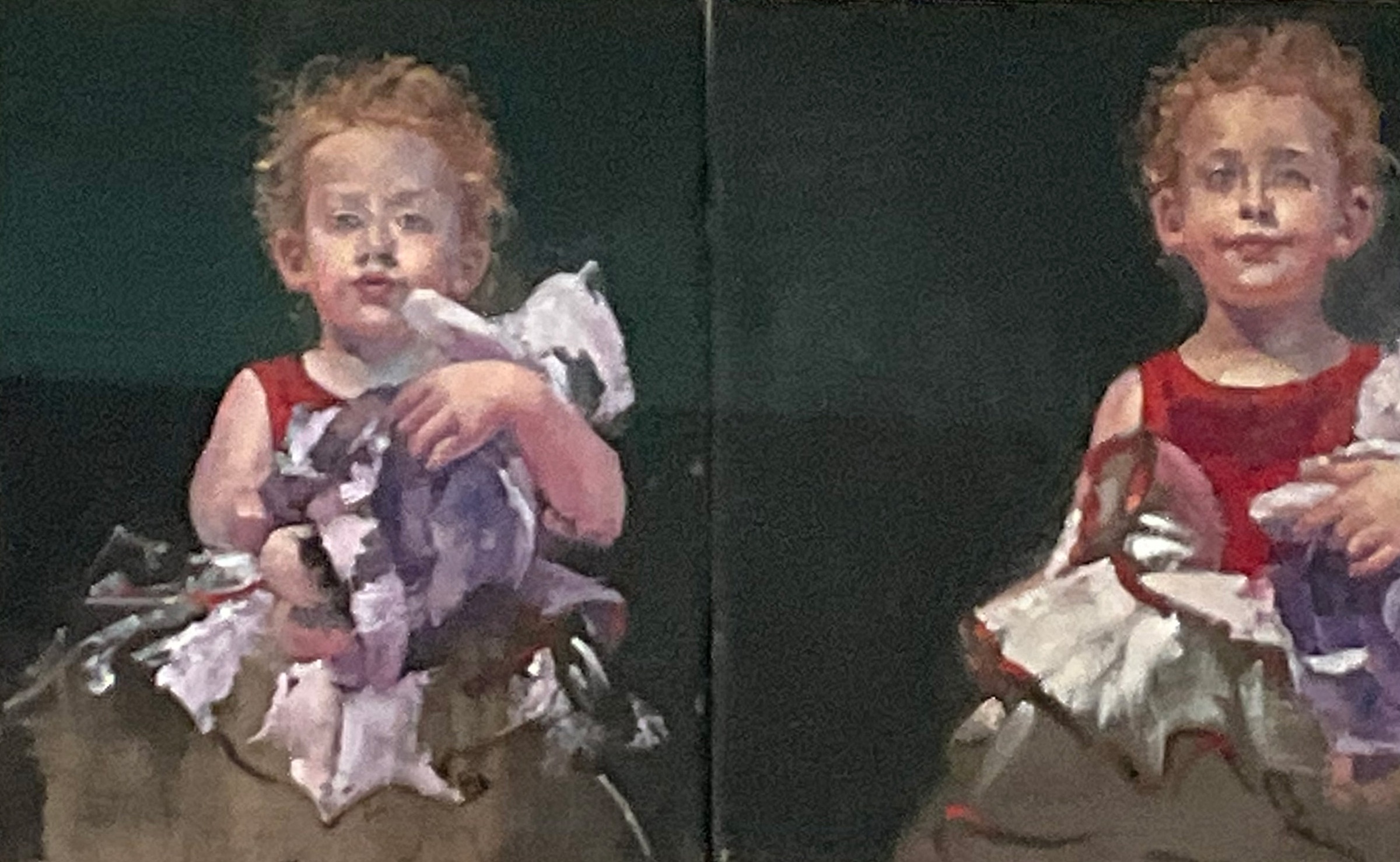 In Portrait of Rafaella, the artist's niece appears twice. The double image has the quality of a time-lapse photograph: read left to right, Rafaella appears younger in the first panel. Only her clothes and soft toy point to this being the same event. Rafaella is captured in motion, her movements in the two frames occurring seconds apart. Childhood is momentary; the growth of children rapid and exacting. For an observer, these changes can appear dramatic – the child a different child day-to-day, even moment-to-moment.