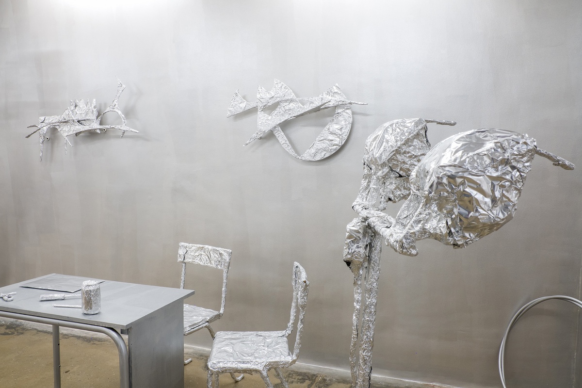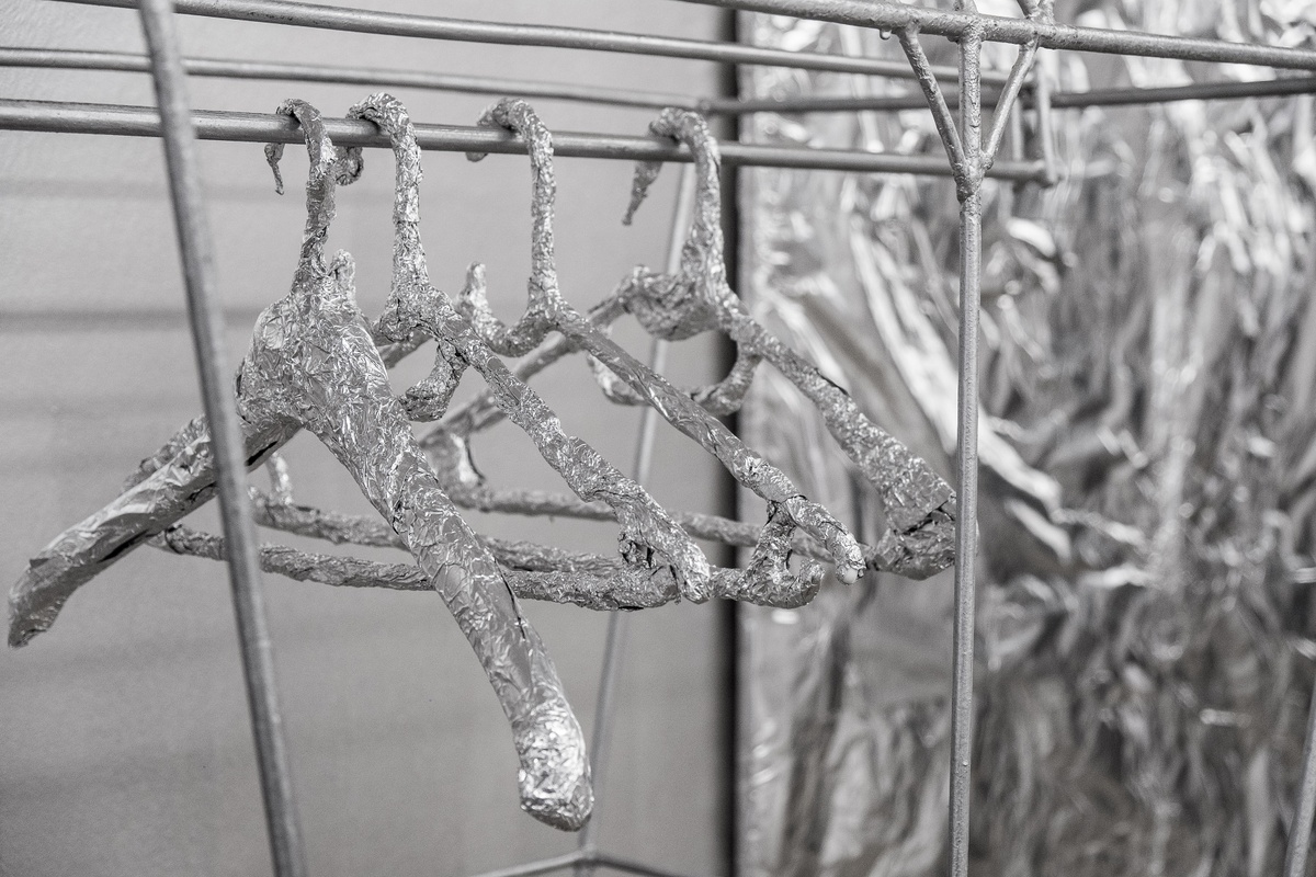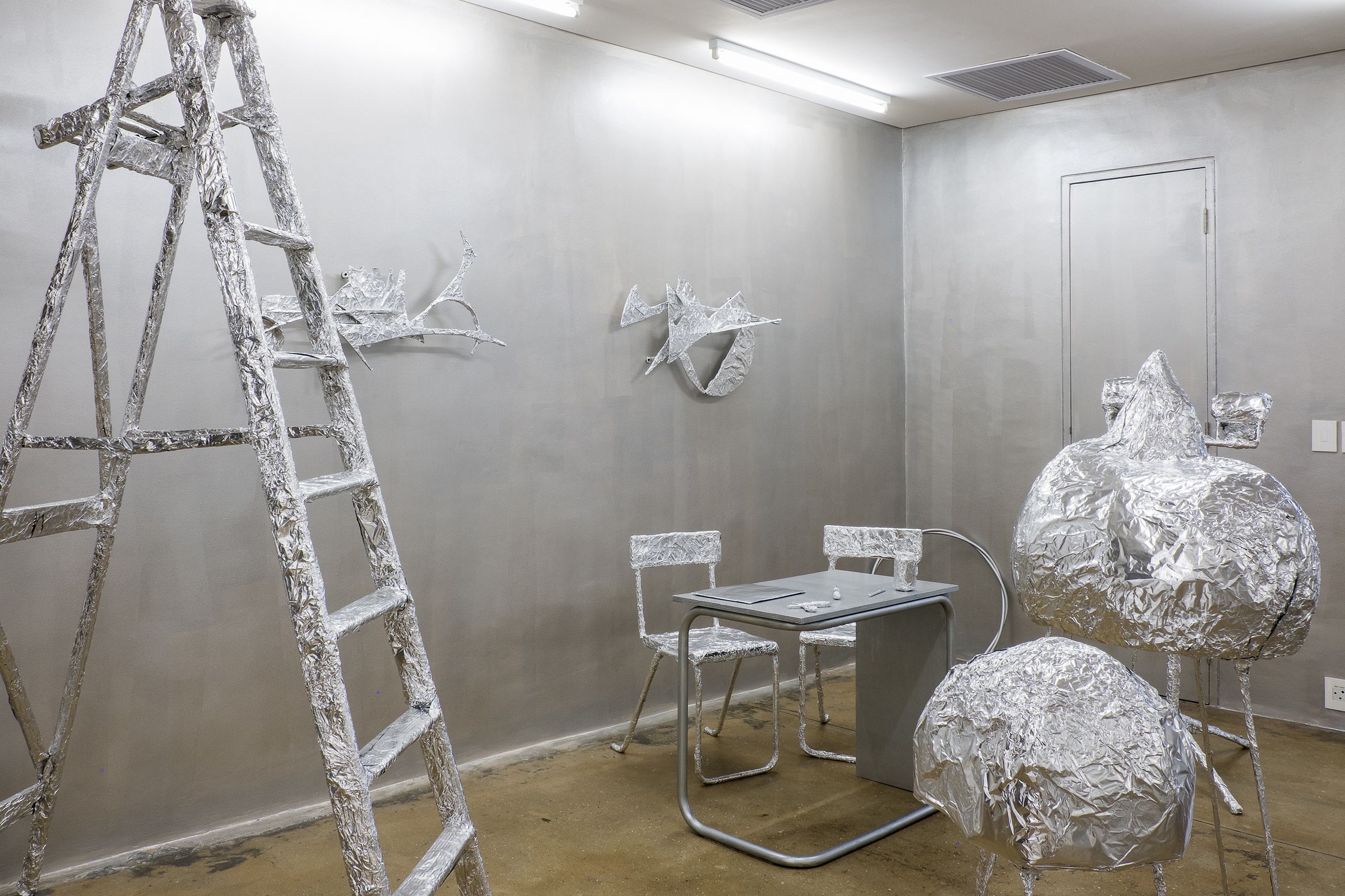 There is to much of de Wet’s work an admirable spontaneity; as if ideas, occurring to the artist, were soon after realised as artworks with neither doubt nor delay. Such is Untitled, in which de Wet wrapped everything in his studio in foil. The question here is not why, but rather why not. Why not! (This appears to have been de Wet’s guiding motto in all things.) Rendered unfamiliar in foil, each object became a formal proposition, a study in the incidentally abstract. Untitled was first made in 2013 for Housewarming, an exhibition of resident artists at Atlantic House, Maitland. It was remade the following year as a more permanent installation (de Wet had, in the meantime, restored his studio to its original function).