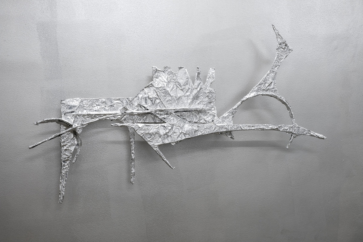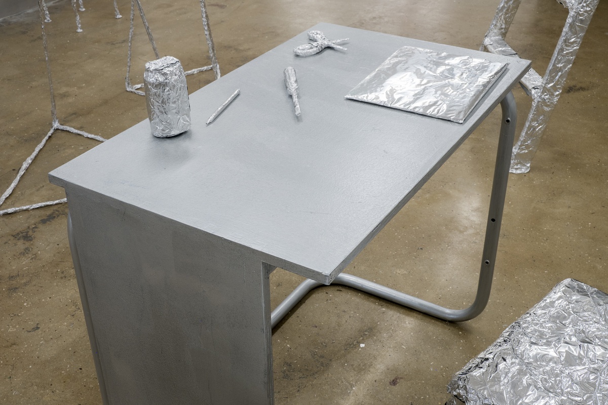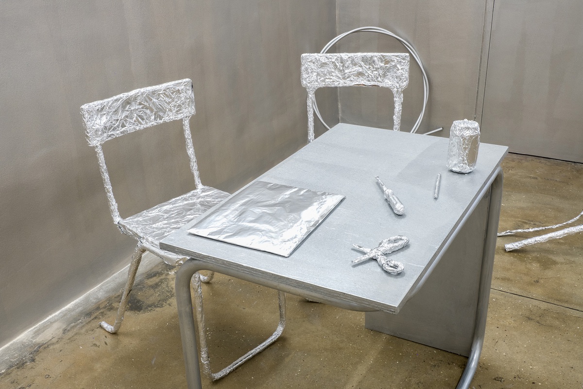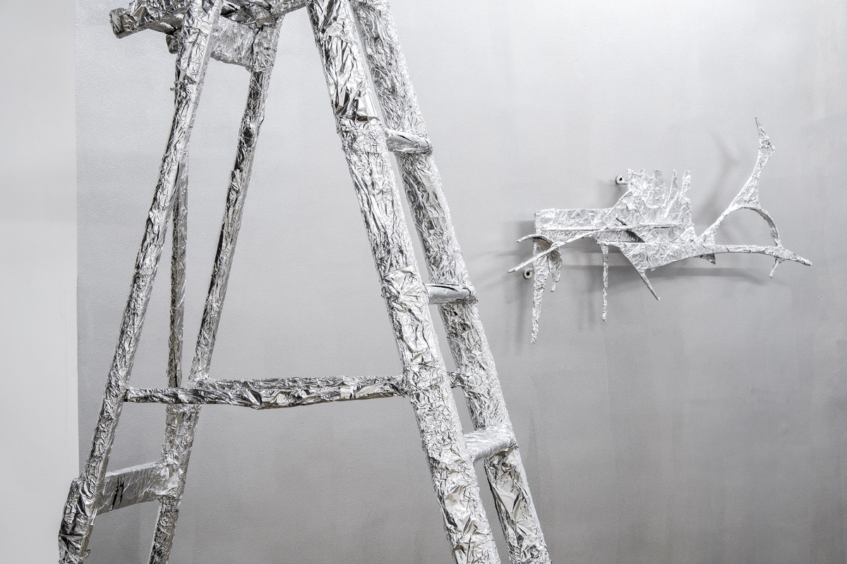 There is to much of de Wet’s work an admirable spontaneity; as if ideas, occurring to the artist, were soon after realised as artworks with neither doubt nor delay. Such is Untitled, in which de Wet wrapped everything in his studio in foil. The question here is not why, but rather why not. Why not! (This appears to have been de Wet’s guiding motto in all things.) Rendered unfamiliar in foil, each object became a formal proposition, a study in the incidentally abstract. Untitled was first made in 2013 for Housewarming, an exhibition of resident artists at Atlantic House, Maitland. It was remade the following year as a more permanent installation (de Wet had, in the meantime, restored his studio to its original function).