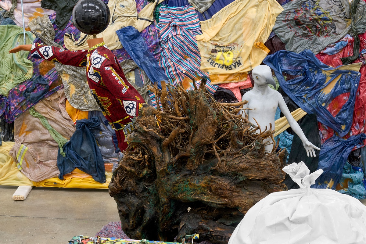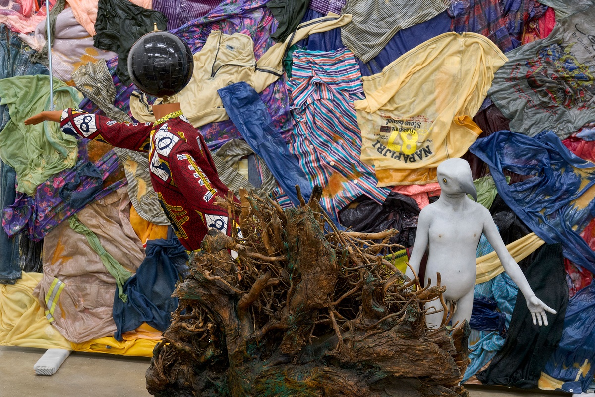 Oil-painted fiberglass, found shoes, found TNT explosive box