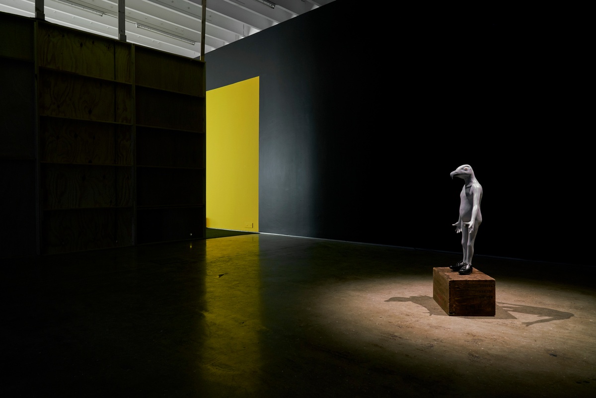 Artwork: Jane Alexander, Security Bird (2014). Oil-painted fiberglass, found shoes, found TNT explosive box. Bird: 78 x 48 x 24 cm; box: 24 x 45 x 30 cm. Private collection.