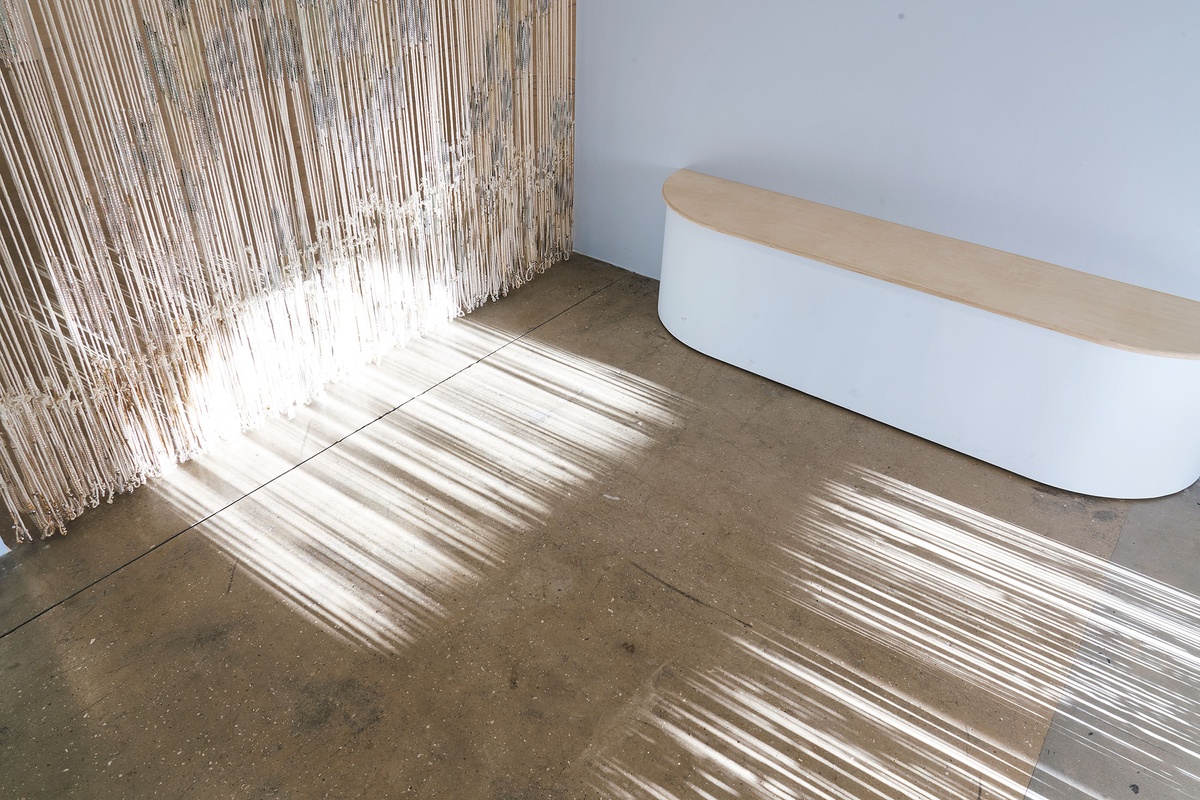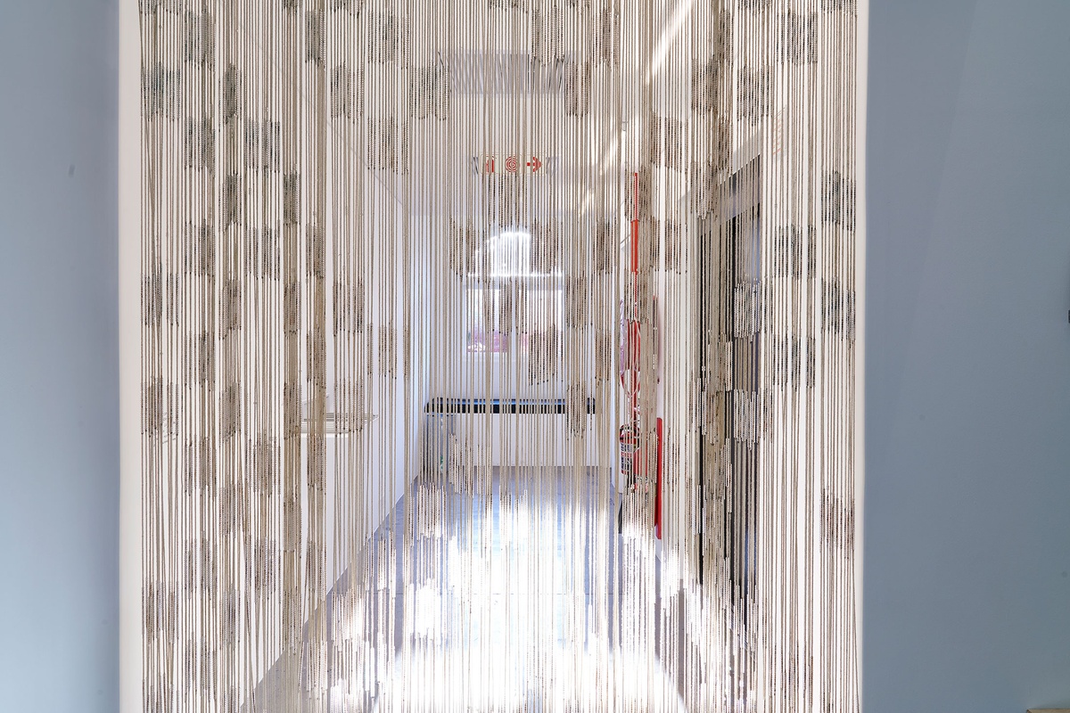 "A4 commissioned a beaded work from Igshaan Adams to coincide with the opening of our foundation’s premises in 2017. We have found ourselves calling on Al asma ul Husna, named by the artist to recall the 99 names of Allah, on many occasions since. Hung like a curtain, it lives in our Reading Room. From time to time, we carry it into our exhibitions where the work becomes a device to mark a transition. A threshold between one state and another, its fall of beads and string provides a soft boundary, a note – now, you are here. In Customs, curated by Sumayya Vally and Josh Ginsburg, 2 July–8 October 2022, Al asma ul Husna enclosed a selection of books and reading material to do with maintenance, ritual, use, and tradition.