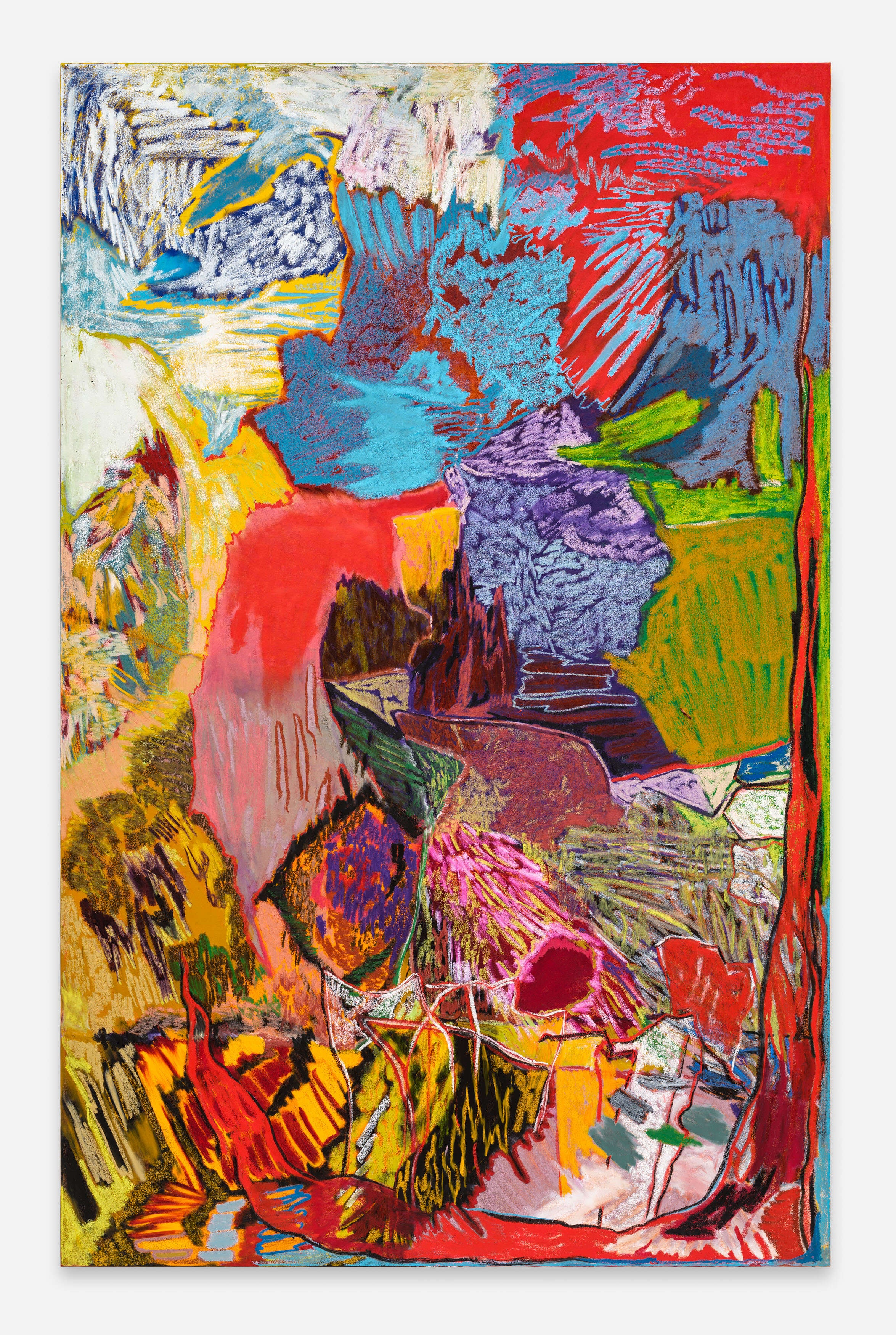 In SMIIILLLLEEEE, Jones asks after the titular gesture as a spontaneous expression of happiness, a more ambivalent guise, a veiled threat, a refusal; as an action or suggestion, a command. To the artist, the mouth is the site where diverse identities are spoken or silenced; where voiced histories, oral traditions, and values are conveyed or quieted. Writing on the occasion of Jones’ exhibition SMIIILLLLEEEE (2021), in which this work was included, poet Vanessa Onwuemezi speaks to the artist’s compelling confusion of optimism and opposition: “Joy. And violence of opening wounds a tooth-slice, a jagged rip, heavy lined expression glorious, glorious as the sunshine hits us, wink of the glint of gold teeth smiling defiance, smiling the bright of day.” The coincidence of images in this passage echoes the apparent tension of Jones’ brilliantly saturated painting, its scrawled lines in turns joyful and resistant. As to the smile of the title, look to the bottom of the painting, to the outline of teeth, and the suggestion of a red lip arched upwards to the left, topmost corner.