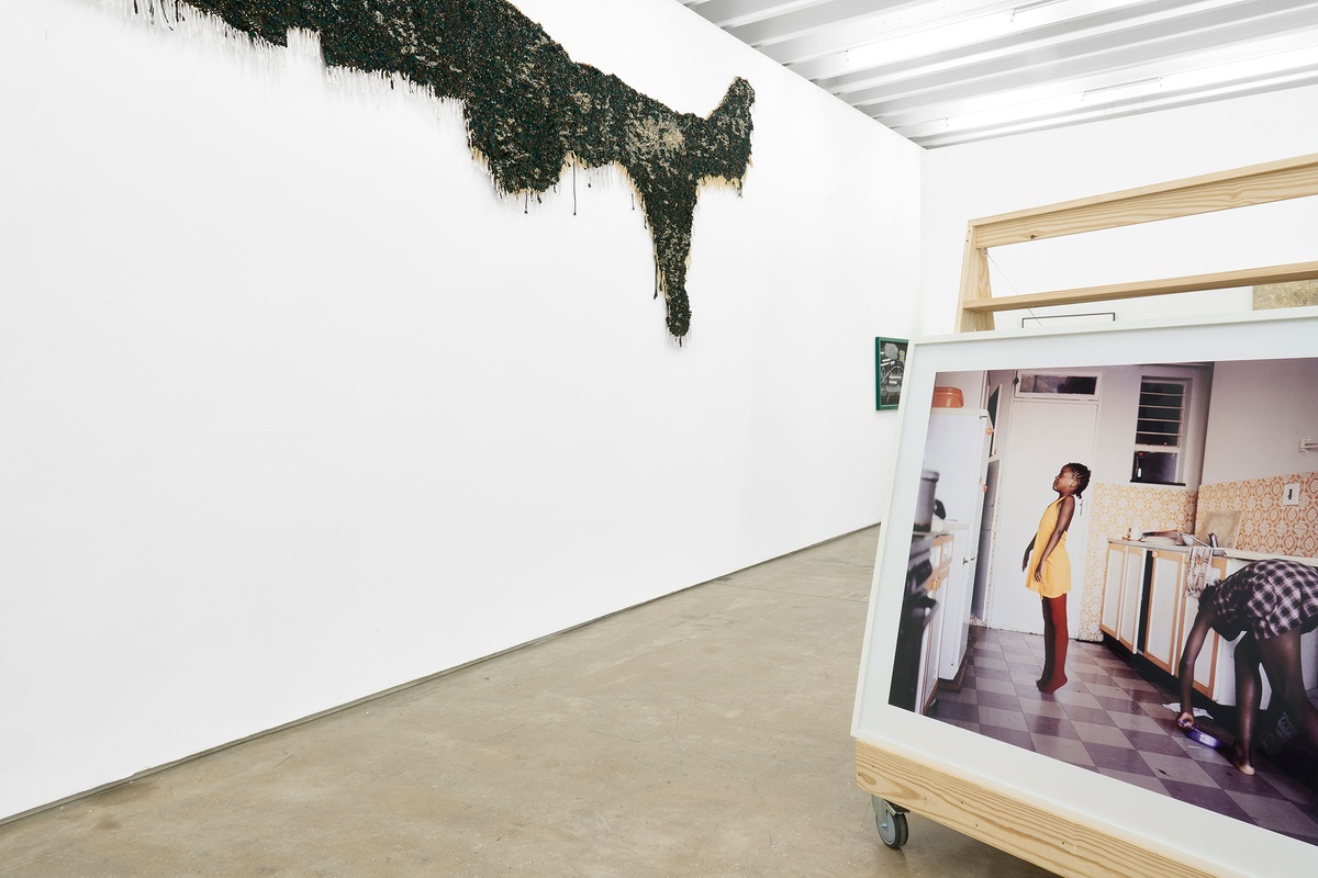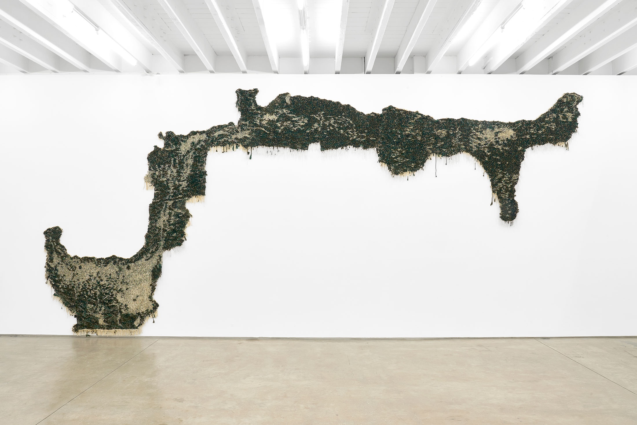 Collected under the loose description of tapestry, Igshaan Adams’ woven works offer a haptic meditation on the changeability of being, which is never static but always reworked, stitched and unstitched. To the artist, the ritual repetition necessary to his medium presents itself as spiritual simile; each bead strung a material dhikr. Much like the ninety-nine names of Allah are chanted in Sufi practice, that they might wake the dormant divine within the speaker, so weaving too is an embodied commitment to slow accumulation and transformation. Bearing witness to life’s traces and traumas as inscribed in overlooked spaces – particularly those of Bonteheuwel, a low-income suburb on the Cape Flats where Adams was raised – the artist transcribes desire lines across fields and worn paths on linoleum floors, honouring the passages of time and people that shaped them. Adams’ work is marked by both a distinct, even sensual, pleasure in the tactile, and a lyrical invocation of the immaterial; the patina of the past distilled in objects of singular beauty and quiet dedication.