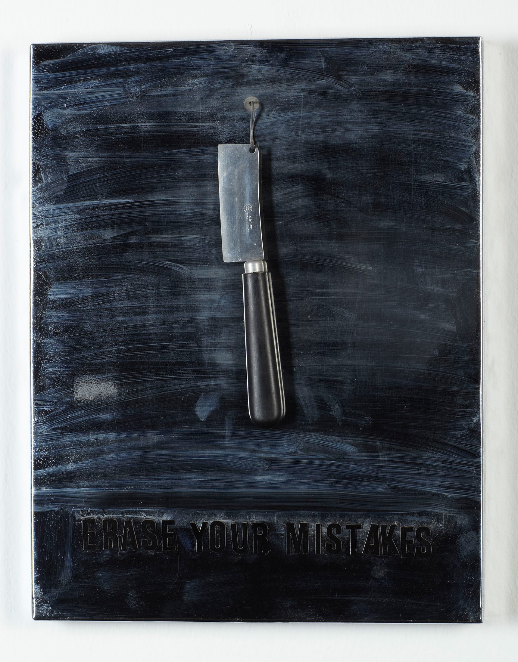 Artwork: Belinda Blignaut, Erase Your Mistakes (1993). Metal base with hook holding knife, and magnetic wording. 37 x 40 x 5 cm. Artwork courtesy of Jack Ginsberg. Image © Sebastian Voigt.