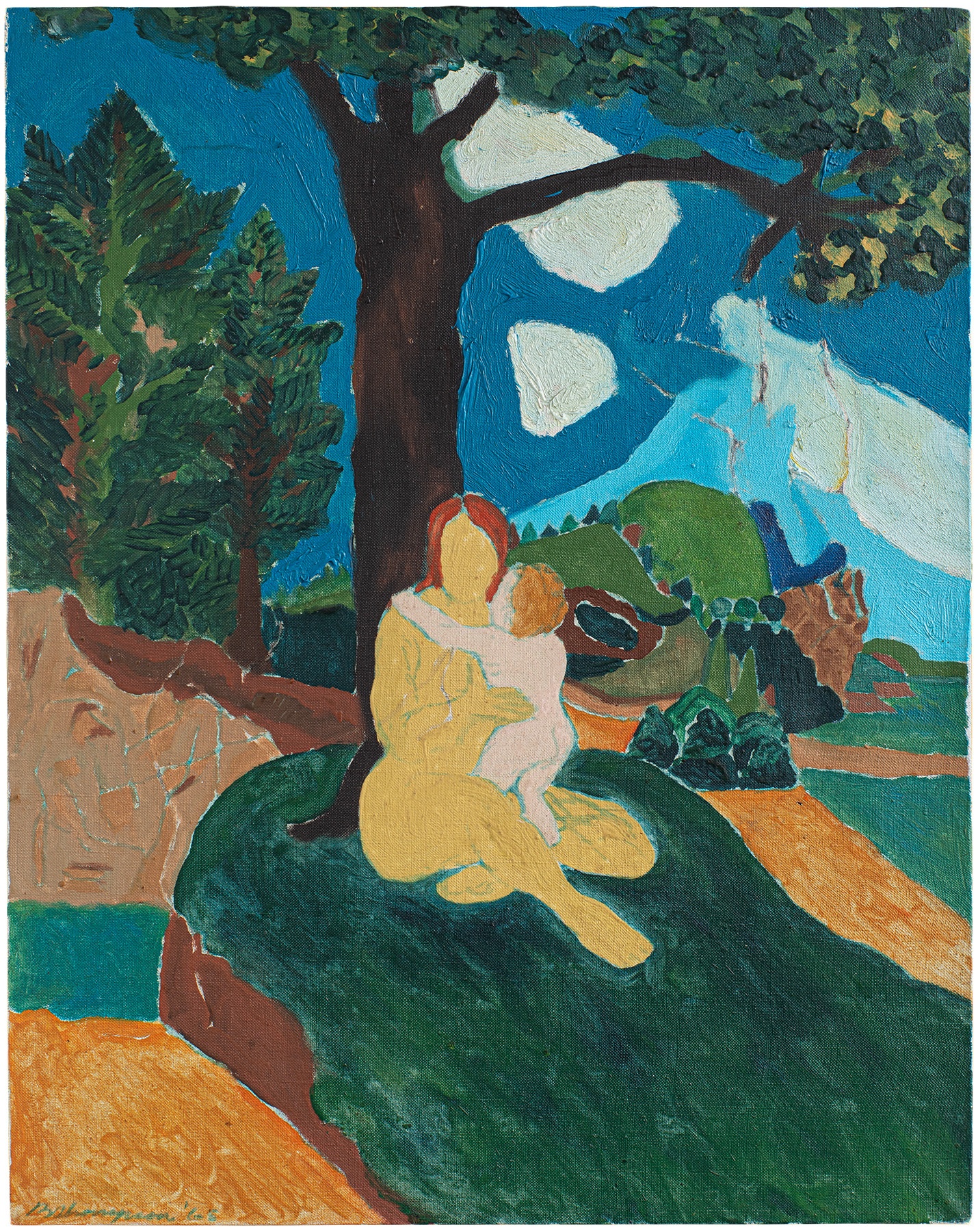 An expression of a pastoral idyll after the French Painter Nicholas Poussin, whom Thompson greatly admired, Mother and Child is a more muted scene from an artist known for his electric palette and compositional complexity. Characteristic of Thompson’s figuration, the titular pair are without detail, reduced to their barest forms, woman and infant described in fluid blue lines, half-hidden beneath their overpainted flesh. The surrounding landscape is composed of planes of colour that seldom overlap, leaving a thin seam between each shade. While the painting is reminiscent of Christian iconography, to the artist, the female nude was intimately entangled with nature as an art historical ideal and became a recurring motif in much of his work. A painting of identical composition and title made the same year offers a saturated counterpart to this work’s subdued tones.