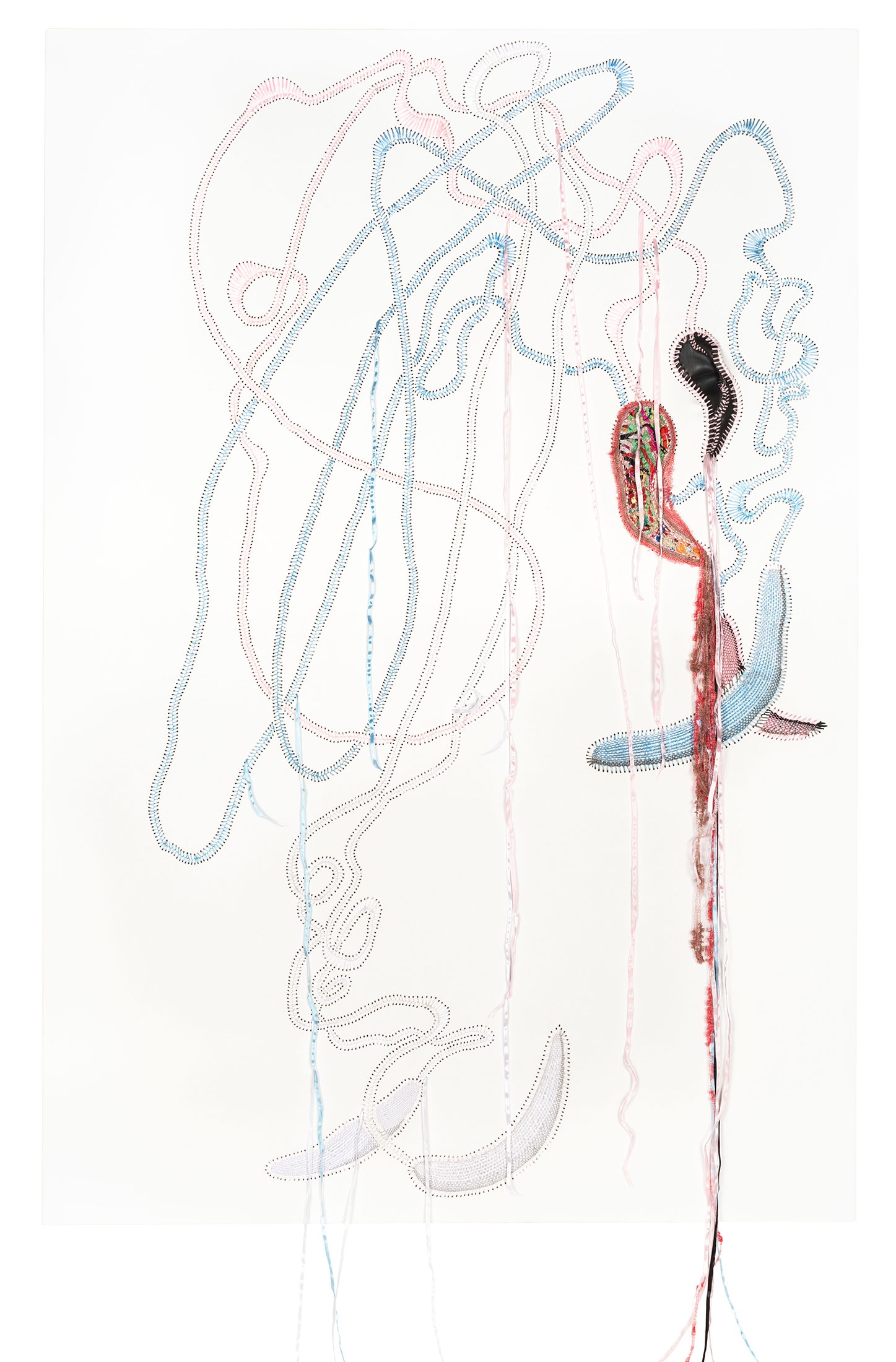 Endothelin is a detailed composition of canvas cut and sewn with the precision of a surgeon’s knife and needle. Taken apart only to be put together, Hlobo’s painting is a ritualistic gesture of restoration, the surface embroidered with ribbon along the seams of each slit. Intricately worked, the canvas evokes organic and corporeal images – the wandering lines the filigree of nerves or the mycelium of mushrooms. To the artist, his paintings are as an embryo only just beginning to take shape, where “all that is readily discernible are the traces of veins.” The work is named for a peptide – an amino acid compound.