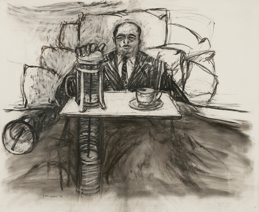 Moving images are the nexus of Kentridge’s practice, from his earliest animated films to his projections for theatre. As such, many of his static images – his drawings – are either made in preparation of movement or are the residue of movement past. Drawing from Mine (Soho with Coffee Plunger and Cup), taken from the film Mine (1991), proves a compelling example of the latter. The drawing shows the character of Soho Eckstein in bed. A ruthless industrialist in pinstripe suit, Soho is a metonym for the greed of white capital in shaping the South African apartheid landscape. He recurs often in Kentridge’s films as image and archetype, a character who seldom plays to our sympathies. In this scene, the plunger of Soho’s cafetière transforms into a sinking shaft, his bedding into the strata of rock. Down it plunges, deep into the mines over which he presides. While black workers labour underground, Soho counts his profits above, balancing lives lost and hardships suffered against his own growing wealth.