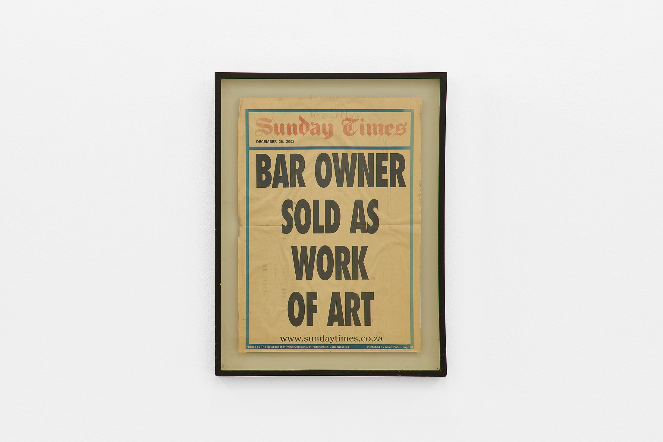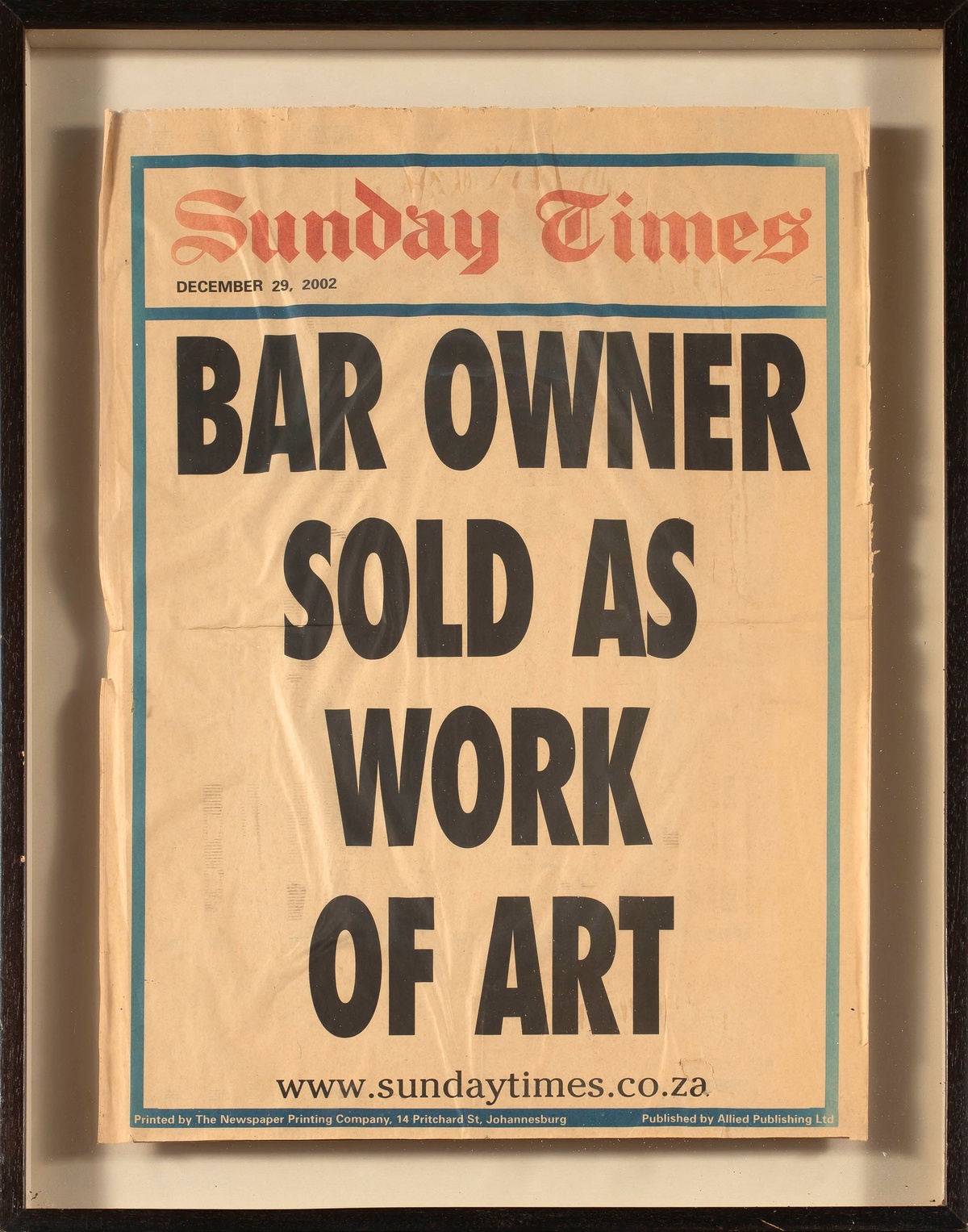 Attributed to Young and his co-conspirator Andrew Lamprecht, who played the part of auctioneer, Bar Owner Sold as Work of Art is a complementary artwork comprised of ephemera from the press coverage of Bruce Gordon (Found Object [concept])’s auction and subsequent donation to the Iziko National Gallery: a Sunday Times street-pole poster and its associated newspaper clipping.