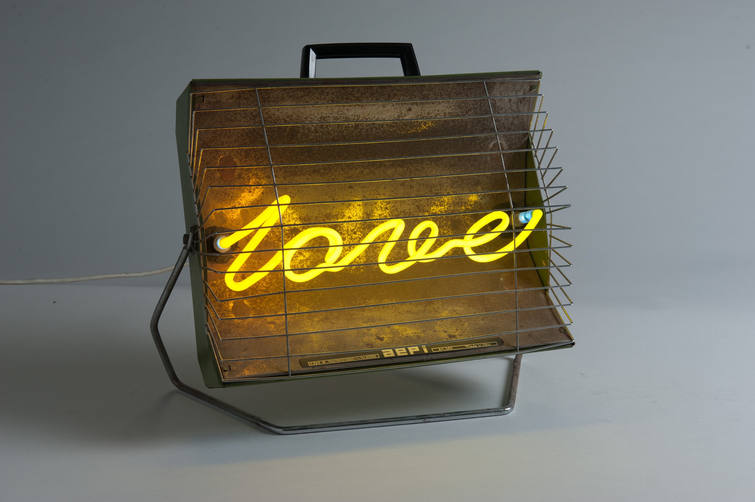 Is Neon Oven Love Y warming, or a warning? A playful, cursive script spells out ‘love’ in bright, attractive yellow. This is the love of sunflowers in summer felt by carefree youth. Except that it occurs locked behind a heater whose metal grille warns that a tetanus shot wouldn’t go amiss should the approach be too close, too sudden. Were one to avoid being caught on the spikes, there’s always the risk of electrocution. Is the fate of love a tragic one? Do these letters warrant rescuing? Is all love self-sabotage; self-immolation?