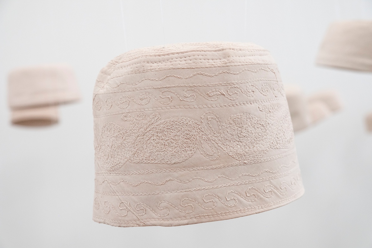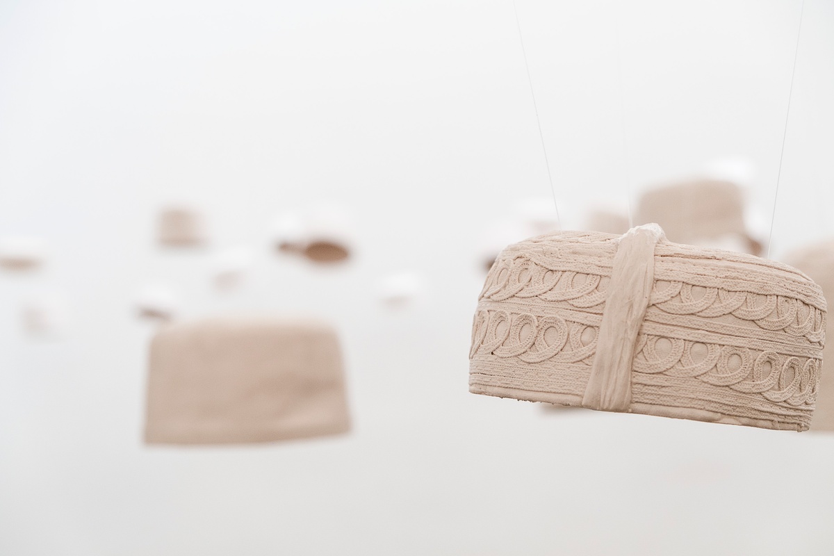 Haunting in the absence it evokes, Gunn-Salie’s Amongst Men commemorates Imam Abdullah Haron, a South African religious leader and activist killed in police custody in 1969. The sixty kufiyas, each cast in white medium and suspended from the ceiling, together stand as metonym for the Imam’s funeral, which was attended by some 40 000 mourners. Accompanying this gathering of unseen bodies, a disembodied voice recites a poem written at the time of his death. “In a prison they placed him / His guilt, his plea for justice,” the poet James Matthews intones, reading aloud his Patriot or Terrorist as an elegy to the Imam’s memory. In its invocations, the work extends beyond the Imam’s burial to consider the role of Islam in the struggle against apartheid, and that of religion and resistance more broadly.