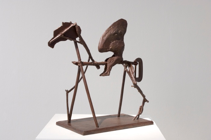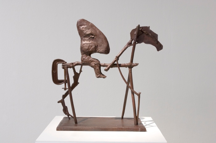 In Kentridge’s many drawings and sculptures of The Nose, a character from Gogol’s short story (1836), the appendage appears on horseback. The horse finds its historical parallel in the mounted heroes of the Soviet Union so often illustrated in social-realist paintings. But where those painted steeds are the expression of their riders’ political power, Kentridge asks what an anti-heroic horse might look like – a horse, as he says, “that would have the least right to be on monuments.” In answer to social realism – in rebuttal – he gives us only the barest suggestion of a horse, a minimal and residual animal made from studio leftovers. “A head, a curve for a neck, some straight lines for legs and a flourish for the shape of a tail,” he says, “are all we need not only to convince ourselves we are seeing a horse, but for us to imbue the horse both with the attributes of the live animal and the associations of their images.” In this sculpture, the animal’s body is made from sticks, its head and neck described in crude cut-out, its tail a metal clamp. However undefined or inexact its image, it remains undeniably recognisable as horse.