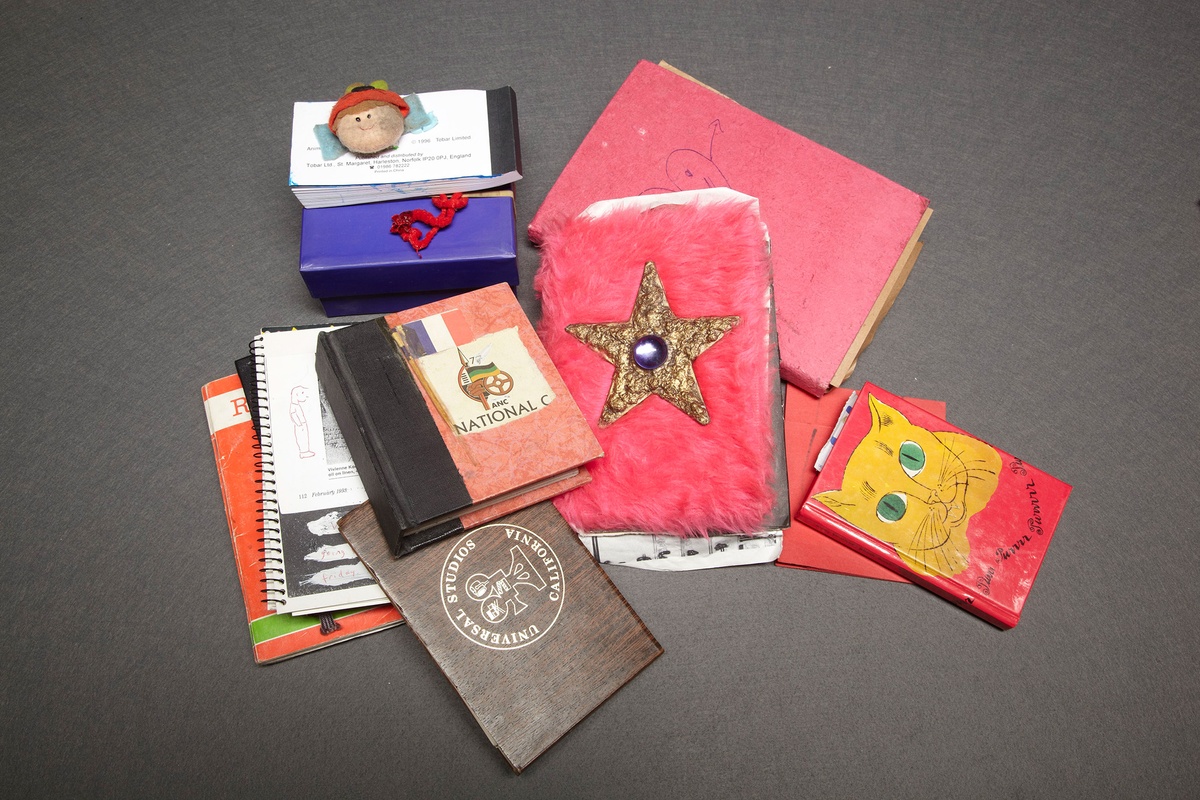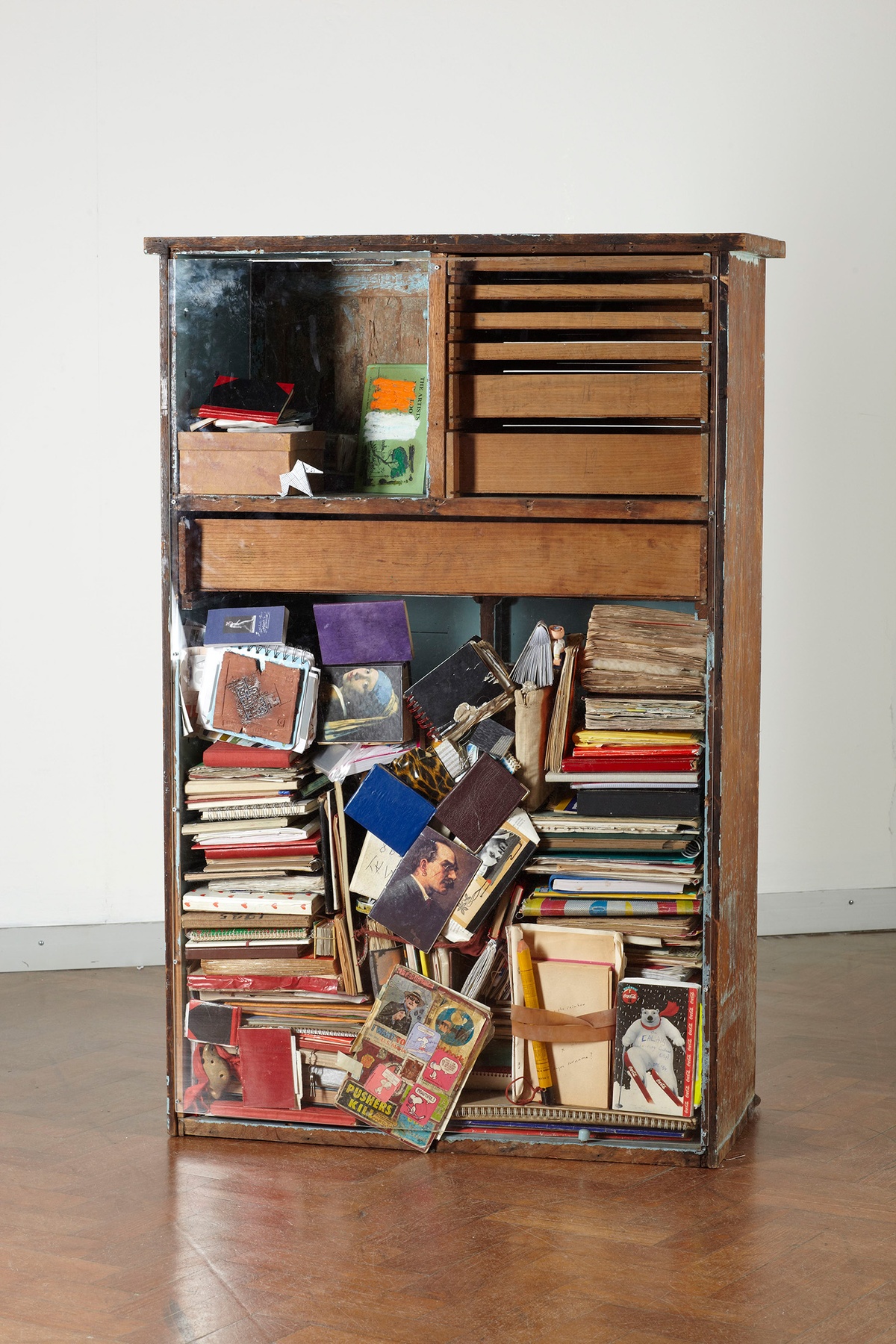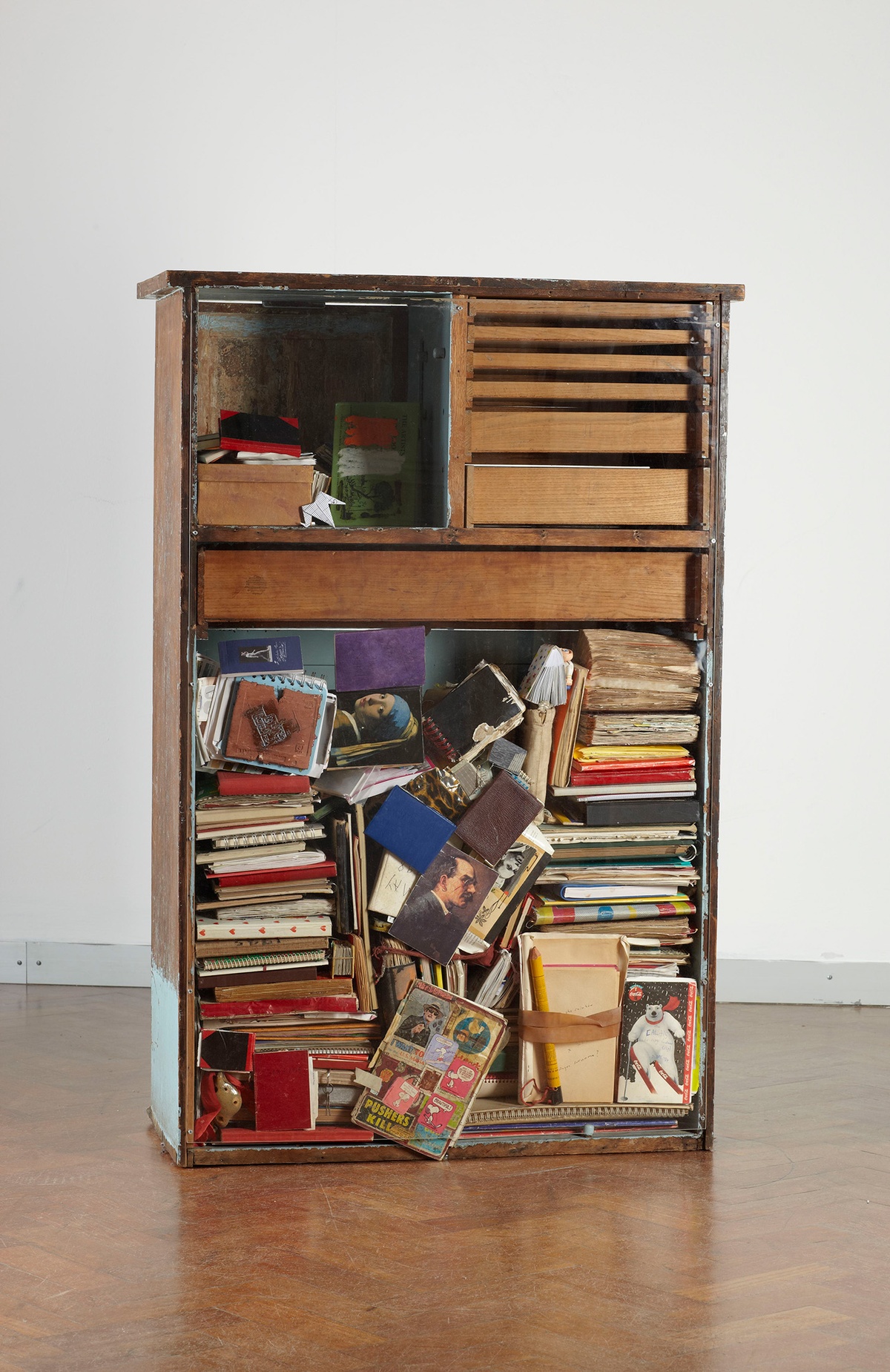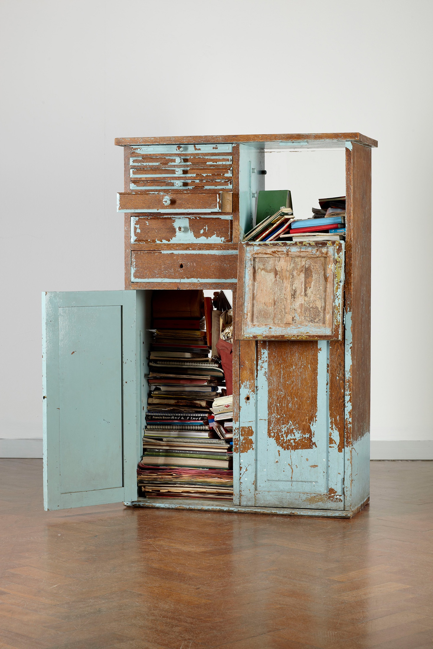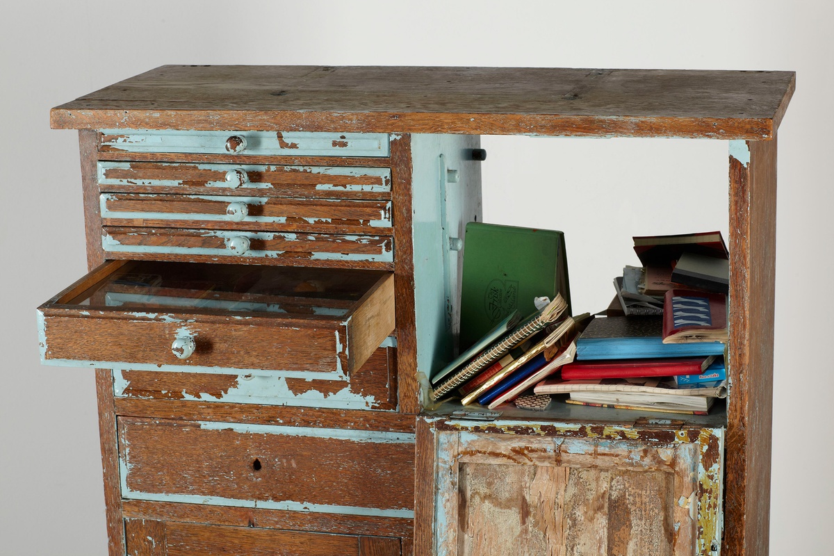 Artwork: George Tobias, Blue Cupboard with Diaries (1969–2009). Wooden cupboard with glass, Perspex and paper diaries. Artwork courtesy of Wits Arts Museum. Image © Sebastian Voigt.