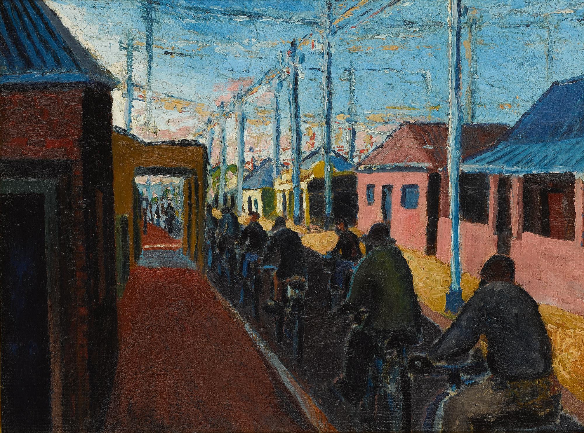 Cyclists in Sophiatown recalls the early morning commute that marked the beginning of each week in the township. “Men were seen less often during weekdays as they went to work,” Sekoto said, “while those few who remained were often engaged in such occupations as one could not always fathom.” Having only just begun to pursue a career as an artist, Sekoto was among those who remained in Sophiatown, having no business in the city. The image of men leaving for work would remain vivid in the artist’s mind, this coming and going that gave shape to the days. In exile, he included many such bicycles in his ‘memory paintings', invocations of remembered township scenes.