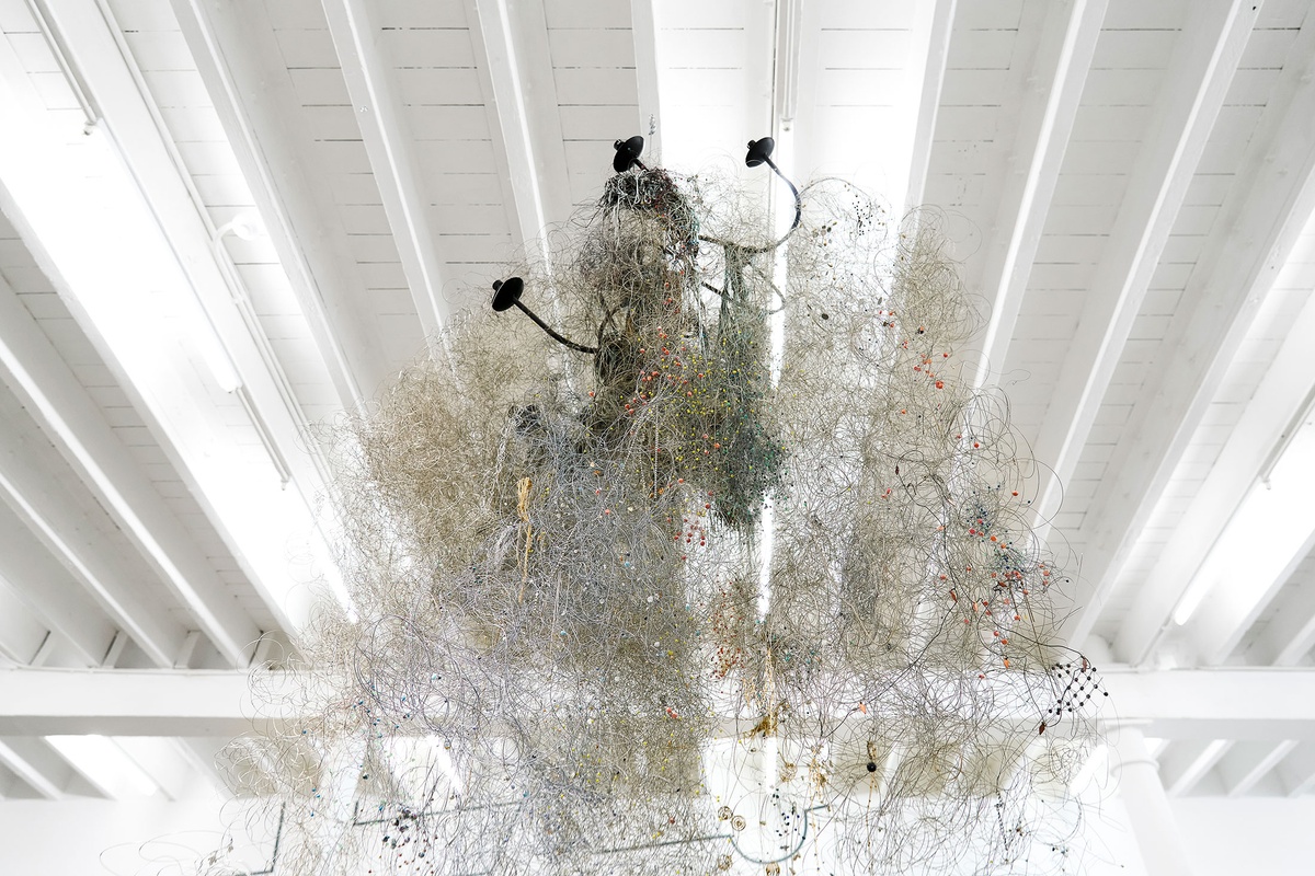 When Igshaan Adams took up residency at A4 in August 2020, the first work he hung in the gallery was the sculptural form Oorskot (2016). A predecessor to 65 Bloem Street, Oorskot was placed in almost exactly the same location 65 Bloem Street later appeared in the exhibition Customs at A4. An accumulation of beads, wire, and rope, Adams spoke of the work as a place for play as well as risk. Pieces stored from past tapestries found themselves accumulating form, gathering in what the artist described as dust clouds. Recalling one particular day, standing alongside Adams as he flung a string of jewels toward one such sculpture; it caught, the dark glass beads seeming both dangerous and tenuous. This was memory as material. Adams describes these sculptures in relation to his ancestral home of Namaqualand, where children kick up the red sand and soil when dancing a traditional dance called the riel. “That's the visual I have for how I plan on installing these clouds, how I look at them at this point – as the animation of those dust particles, and the movement through this space. How close can I get with this material to that accuracy?” Within 65 Bloem Street is an ensnared chandelier, crystal beads, charms shaped like silver scimitars. Like archived dreams, these hang suspended and glinting in the gallery’s light offering clues; asking questions.