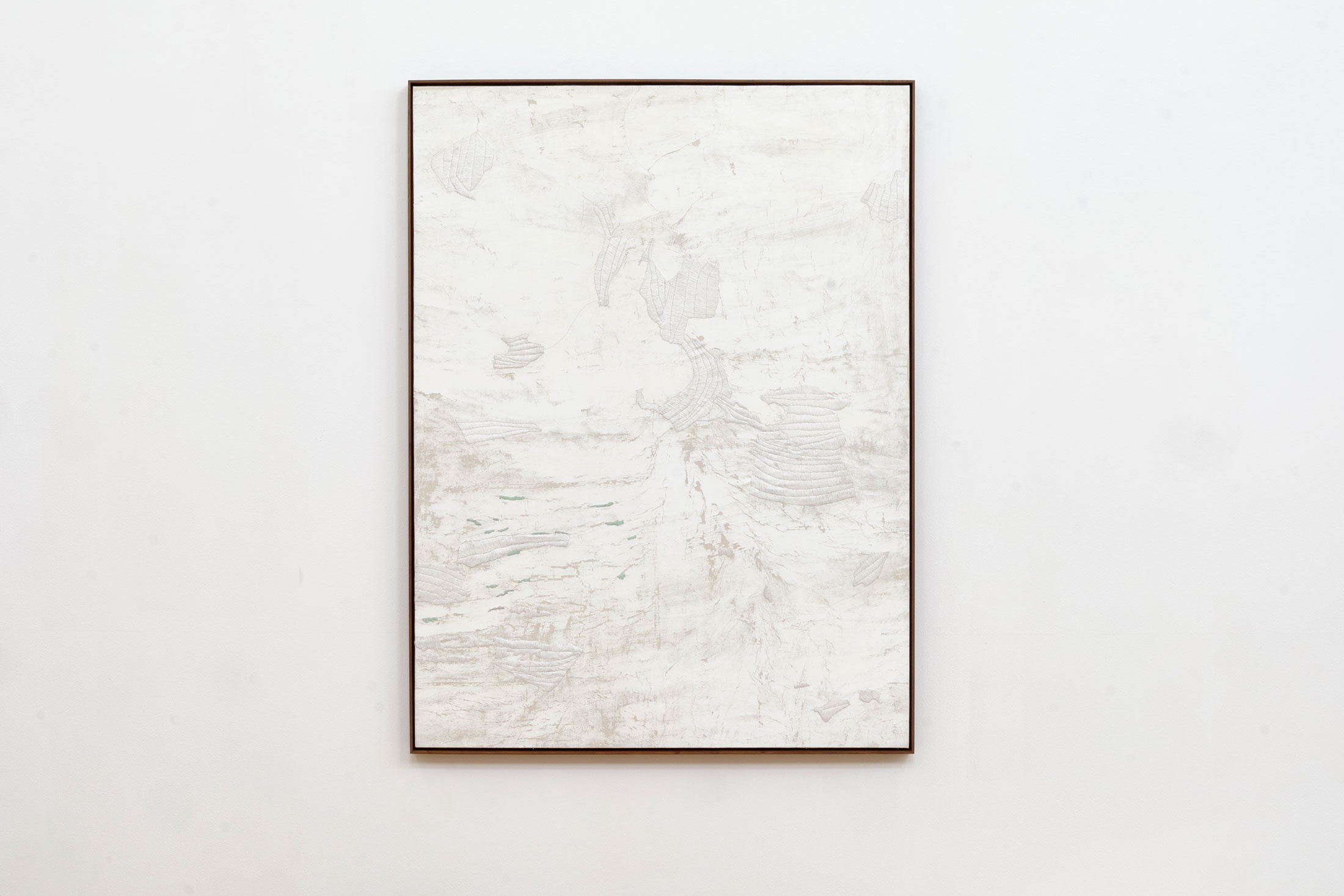 Iqadi is shaped by opposing impulses: to wound and to repair, the artist restaging the slow degradation of time transcribed on the patinaed walls of an ancestral ruin. “This dialectic between trauma and healing,” as Sean O’Toole writes, “is a defining leitmotif of Ntlonti’s paintings. The idea of salvage…is deeply coded into Ntlonti’s work.” The work of the artist is the work of shifting ground, strong winds, bleaching sunlight, spreading damp – in a word: weather. Against what Ntlonti calls her “shy colour” grounds, cracks appear as filigreed veins, stains accumulate, whole flakes of pigment are lifted, the substrate scratched and worn. Iqadi stands as a contranym – the same word, as poet Terrace Hayes writes, “looking in opposite directions.” Like weather and weather, to decay or to endure, the artist disrupts the surface of her canvas that the past might persist in image and memory. Mending even as she abrades, Ntlonti’s embroiders into the fabric, at once concealing and delineating its lesions. Moments of pastel blue thread in the otherwise bone-white composition recall rivulets of running water on a faded earthen wall.