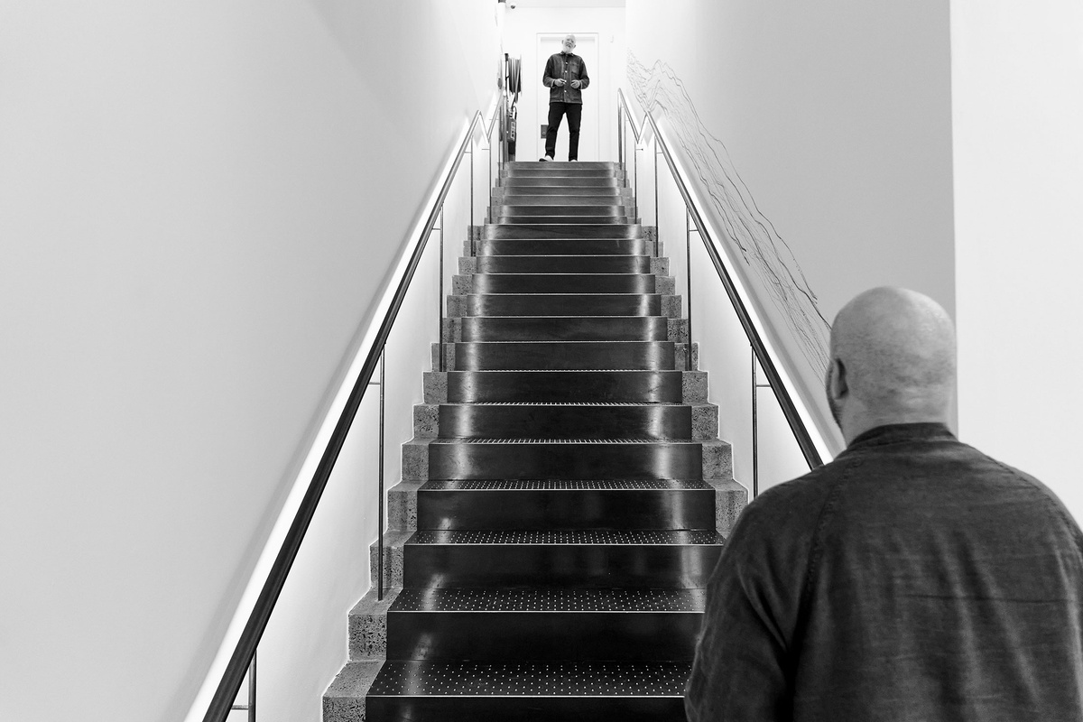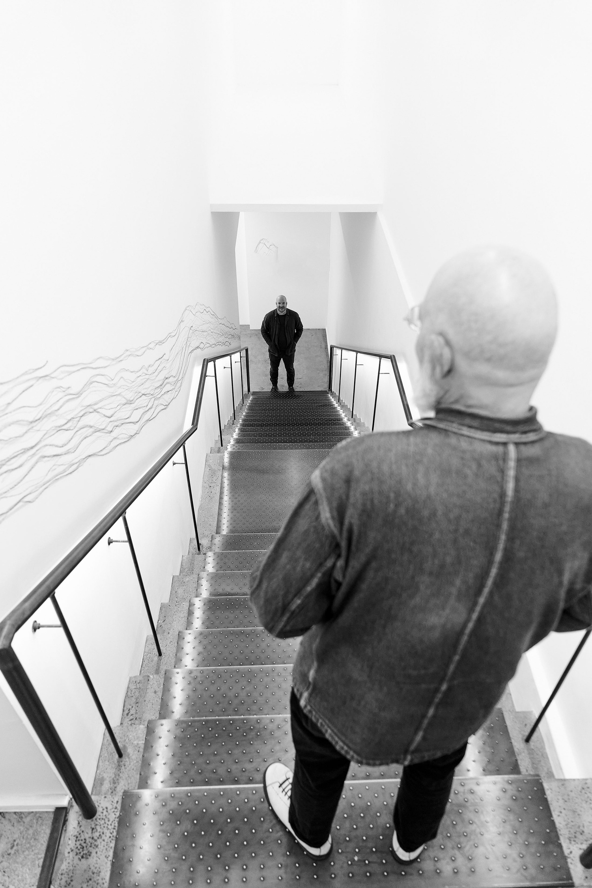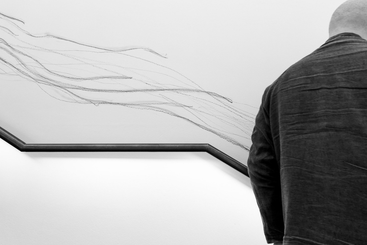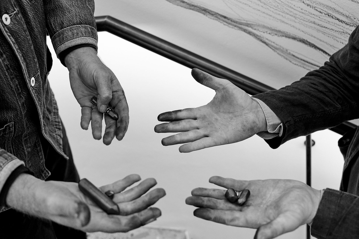 Demonstrating a Drawing with Jared Ginsburg is counted among Christian Nerf’s many ‘exercises’: a series of instructions for automatic drawing strategies to be performed and reproduced by the artist and others. In this work, a ‘non-collaboration’ with fellow Atlantic House artist Jared Ginsburg, the pair walk up and down a flight of stairs, each pressing a stick of graphite to the wall to draw near-continuous lines. They begin at opposite ends of the staircase to meet somewhere in the middle, bumping up against one another. Rather than negotiate the soft obstacles of each other’s bodies and continue on their way, the pair doubles back in opposite directions, only to reprise “this brushing-up-against again and again and again, meeting at different points depending on our paces,” as Nerf says. “Towards and away repeat, all the while dragging graphite bars along the stairwell wall and leaving traces of our interaction smeared up and down the space.”