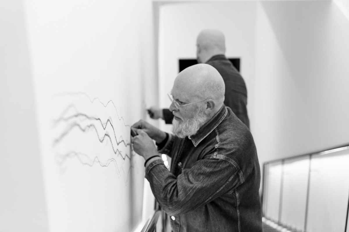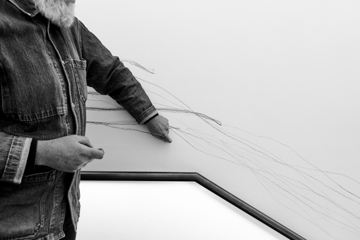 Demonstrating a Drawing with Jared Ginsburg was first staged at the AVA’s 40-year retrospective, A Natural Selection: 1991–2011, curated by Clare Butcher, as an unannounced performance. It has since been applied to A4’s wall twice: in 2019, during Nerf’s residency, and six years later in 2025 to coincide with the exhibition Sightlines. Shortly before the artists took up their graphite for the most recent installation, an A4 team member asked the pair if they were suitably ready to make some marks, perhaps imagining that one might need to limber up for such an activity. To this, Nerf replied that moving through the day and not making marks, intended or otherwise, is surely an impossibility (for him in particular and humans more generally).