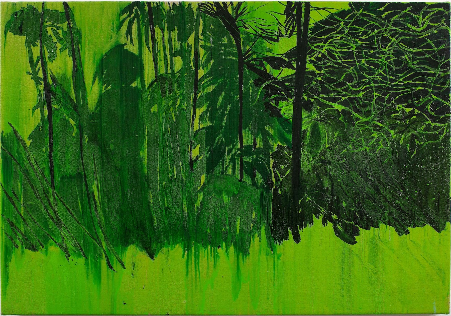 In his Maracas Series, Anderson’s landscapes all but dissolve into green abstraction. Each given a different hue, from chartreuse to emerald, teal and olive, the compositions pair gestural mark-making with startling saturation. Perhaps none is as bright as Maracas Series – Lime Green; the colour pressed to the foreground, the paint’s application all the more apparent for the lack of pictorial depth. Named for the calabash tree found across the Caribbean, the title lends the near-abstract work a figurative frame. Still, the legibility of the scene is largely denied; the landscape notated, as art writer Lisa Turvey offers, in “diluted runnel and opaque blot; audacious stroke and calligraphic tangle; scumble, dot, impasto, and wash, splintering the very terrain it defines.” Resisting landscape’s conventions, Anderson shapes his source material – photographs, drawings and memories made during the artist’s stay in Trinidad, which shares with Jamaica a history of long British colonial rule – into images of the island only loosely recalled.