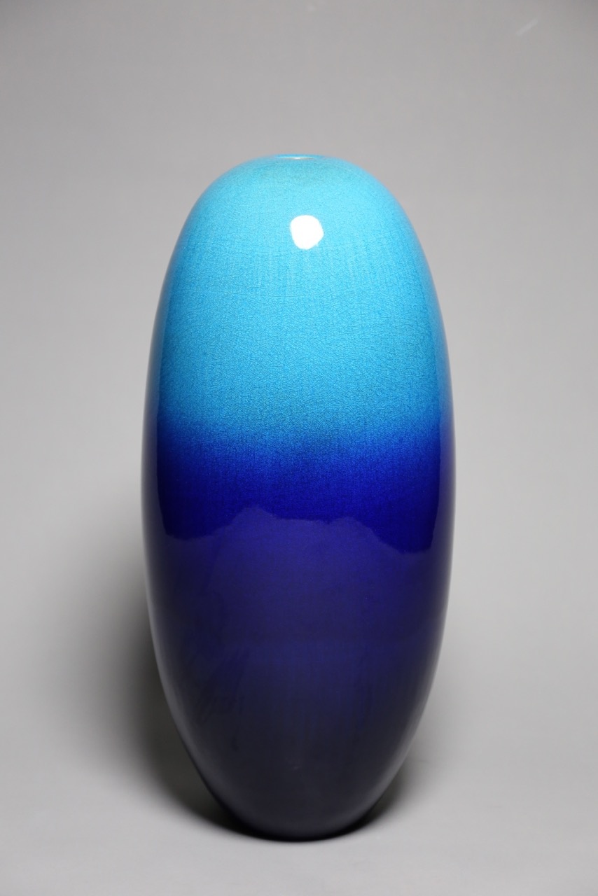 A vase for a single flower, Hekiyu Renmonki is perfectly balanced in form. It is striking for its perfection, for the smoothness of its surface, its flawless, shifting blue. An object of quiet beauty, it offers an eloquent expression of dedicated practice. Being grand in neither scale nor design, the vase’s studied simplicity draws the eye to the transparency of its glazes, which move from the bright cyan at its apex to a deep, royal blue at its base. It is the work of a master confident in his medium, a medium in which he has worked for the past half-century as a monk works at his mokushō, his silent illumination.
