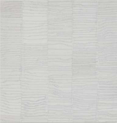 Untitled No. 11 is a work of quiet minimalism. Made from thousands of white glass beads, the slight tonal shifts in their colour record the hands that sewed them; each bead lightly stained by sweat. Seen from afar, the work evokes the abstract paintings of Agnes Martin, an artist and modern-day mystic who pursued a visual expression of interiority and silence. Both Lou’s beaded works in white and Martin’s paintings share a sense of seriality, linearity, and quietude. Seen up close, Untitled No. 11 reveals the exhaustive, repetitive process of its making, the Zen-like tedium necessary to its form. It is the work of an artist deeply engaged in her medium, a notation of time spent, and an acknowledgement of the many women through whose hands the beads have passed.