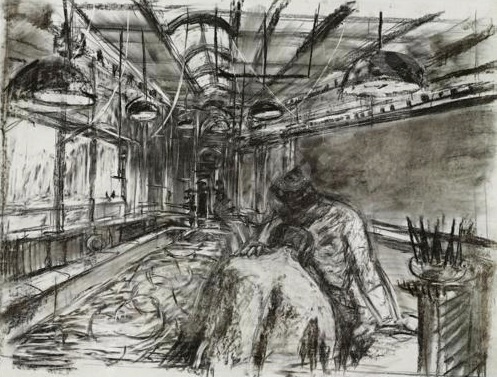 Kentridge’s Johannesburg, Second Greatest City after Paris began as a studio experiment in image and allegory. There was no story planned, no sequence of events arranged. “It starts with images that interest me, or provoke me,” Kentridge said of his process, which is largely given to association and suggestion. The work sets the scene for the following eight films in Nine Drawings for Projection – “that rather desperate provincial city” of Johannesburg – and introduces the three leading players. There is the pinstriped industrialist Soho Eckstein, the empathetic Felix Teitlebaum (perennially naked), and Mrs Eckstein, who plays the parts of both Soho’s wife and Felix’s lover. Each is accompanied by a character summary of sorts, appearing momentarily on the screen: Soho “takes on the world,” Felix is “captive of the city,” and Mrs Eckstein is “waiting.”