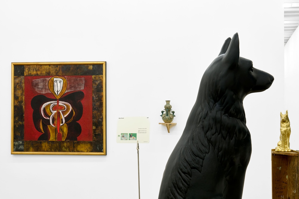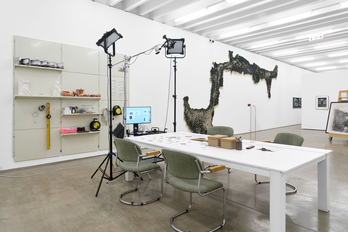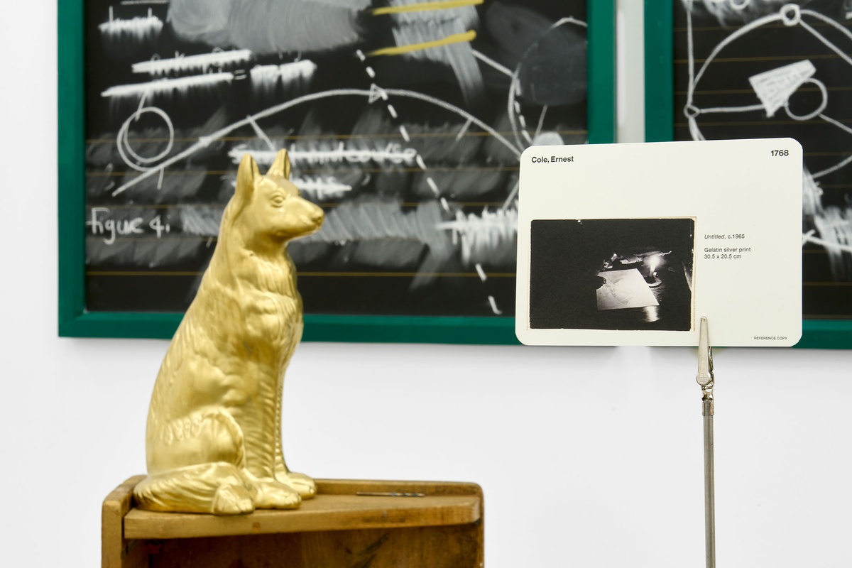 "It took a moment of pushing and pulling at the moveable walls for our curatorial team to figure out how much space to give Kemang Wa Lehulere’s Cosmic Interluded Orbit (2016). The installation has remarkable presence. It is so very still. Yet, on the chalkboards, these whizzing diagrams, abandoned experiments in magical science – it is these, perhaps, that turned those dogs to gold. Read as an interlude, as its title suggests, everyone’s on a space trip, with the room gone to the dogs. Wa Lehulere is an alchemist. No other artist in South Africa is able to grasp so firmly onto history’s long tail and pull out infrastructure for the imagination. He works best with dimension, where frames and objects jut and push into the room. Modest materials (chalk, bricks, blackboard, repurposed school desks) and these ceramic dogs have recurred throughout his practice. As George Mahashe wrote, Wa Lehulere’s works historicise key moments in this country’s history and 'simultaneously inscribe the diversity of concerns animating South African and some diaspora artists; ideas like a fascination with outer space as well as other scientific and occult tendencies.' Writing in 2016, Mahashe bemoaned the exclusion of these themes from a dominant discourse that pigeon-holes these artists only into 'conversations about politics of the gaze or some form of self-representation…that only lives within an economy of filling a gap in the Euro-American archive and history.' One wonders how long the orbit will take, what the teacher might have to share on his return."
