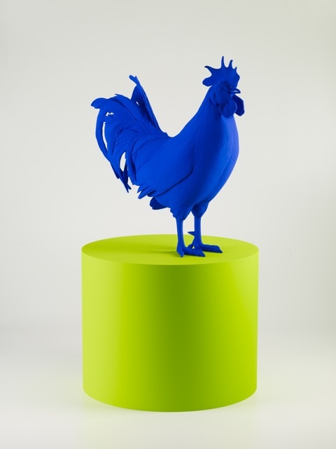 Fritsch is no stranger to repetition – indeed, many of her works exist as multiples, shown together, apart, or in strange tableaux with other objects. Such is Hahn/Cock, a small replica of a public sculpture. The brilliant blue rooster first appeared on the fourth plinth in Trafalgar Square, London, in 2013. It has since appeared elsewhere – most notably in the sculpture garden at the Walker Art Centre in Minneapolis and on the roof of the National Gallery of Art in Washington. Where those works were monumental in scale, this version stands just under a metre high. Set on its lurid green base, the cockerel is at once lifelike and distinctly unreal, its interpretations as symbol various and contradictory. To the artist, however, the pleasure of the work is not in its import as sign but in the gestalt of its image, electric blue against the green.
