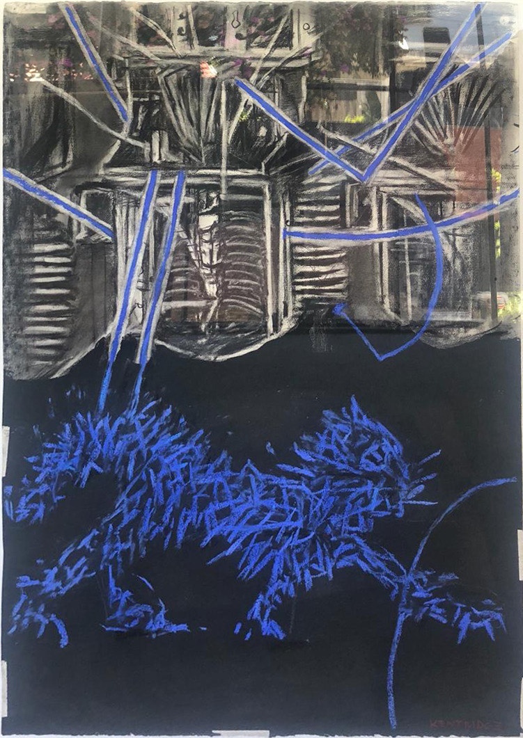 The sinuous black cat is a recurring character in Kentridge’s work, stalking his charcoal compositions and animations alike. In this drawing from Stereoscope, the eighth film in Kentridge’s decades-long series Ten Drawings for Projection, the cat plays an associative and ambiguous role as shapeshifter becoming typewriter, Bakelite phone and later, bomb. “I never start with a meaning, so cannot tell you what the cat symbolises,” the artist says of its import. “If anything – I simply knew that I needed a cat at that moment of the film.” The cat’s image shifts, cleaves, is twinned by the double sight the film’s title suggests. Taking stereoscopic vision as formal device, Kentridge’s film offers an allegory of perception in seeing and sign. The narrative’s blue motif, which draws connecting lines between characters, later electrifies the cat, casting it a cobalt hue, reducing it to a cluster of static lines as seen in Drawing from Stereoscope (Blue cat).