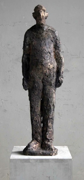 “If you take anything away,” Hans Josephsohn said of his monolithic sculptures, “nothing at all remains. The figure consists solely of relationships… You remove a piece and nothing is left.” For all the apparent solidity of Josephsohn’s work, it has about it a formal uncertainty, its figuration vulnerable always to abstraction. Such pictorial precarity is not uncommon in much post-war European art, together gathered under the loose title of existentialism, which gives expression to the ravages of the Second World War and the loss of faith and meaning that attended it. The war perhaps also accounts for the muteness of Josephsohn’s figures – the artist himself was voiceless under Nazi persecution, fleeing his native East Prussia first for Italy and then to Switzerland. The human, Josephsohn’s sculpted figures suggest, is both frail and enduring, easily broken and lasting. Though modern in mood, his works appear as ancient artefacts, figures from antiquity, archetypal and weathered by history. Josephsohn’s sculptures, reduced to those details most essential to their form, maintain a tactile complexity, each made from accumulated plaster applied in mottled layers. Later cast in brass and left unpainted, they appear as relics made from rough-cut stones.