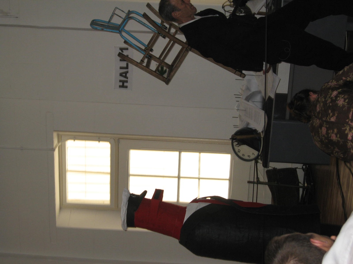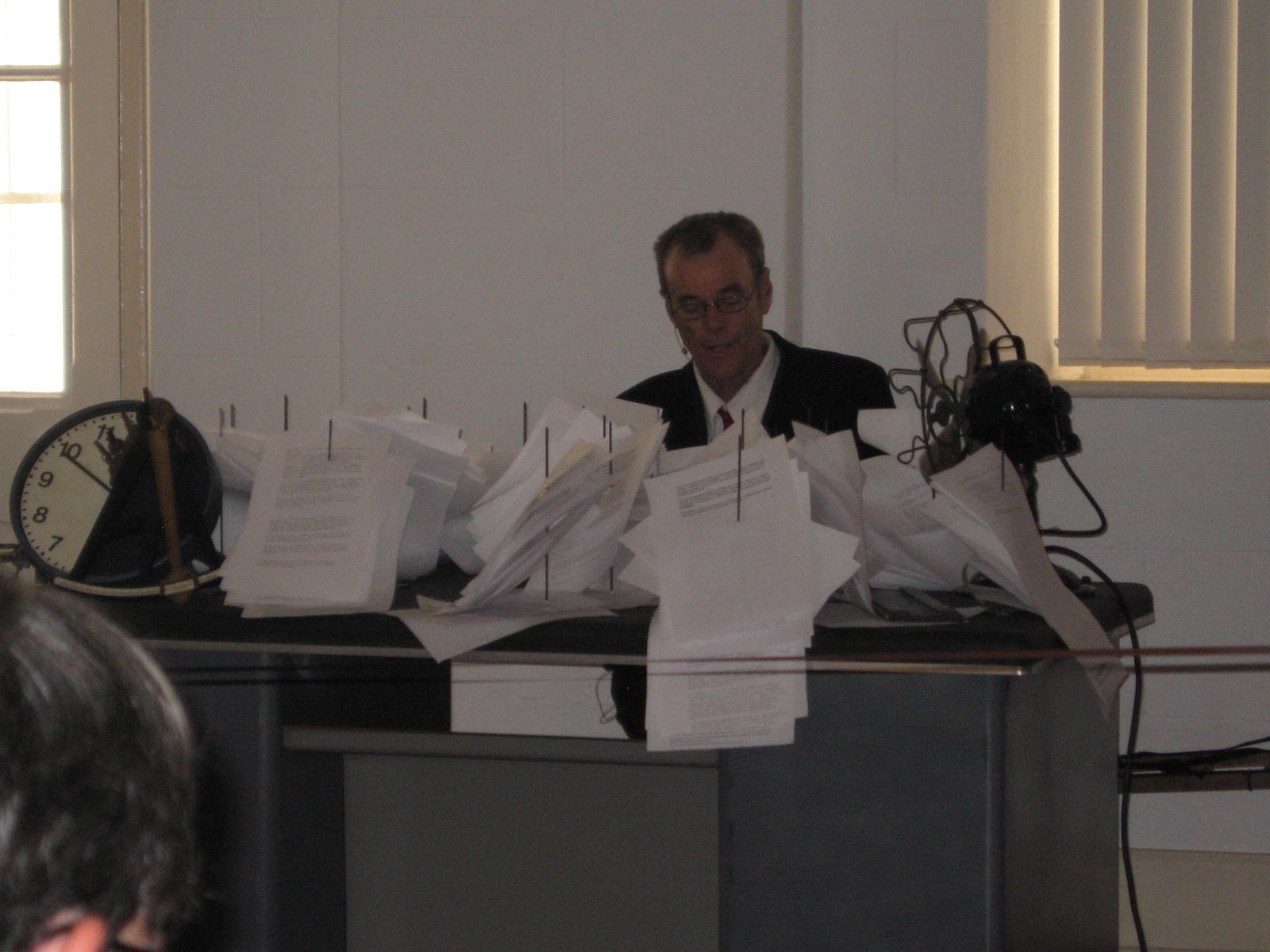 The physical aspects of the performance were a few quotations from Possession work (Aletta ripping, while sewing, cloth and singing a lullaby; Andre in the Postbox Captain; an attempt by myself to walk back and forth in lead soled boots carrying a springloaded crate on my back) plus a few traces of a dimly perceived future work, Shakespeare’s Chair (Chas as a Chameleon Man hauling the recording tape across the stage; pages of the fragmentary text, on office spikes, fluttering in the breeze of a desktop fan; the steel desk; a Meccano maquette of the chair; and the presence of several readings from the embryonic text woven into the layers of the taped soundtrack).