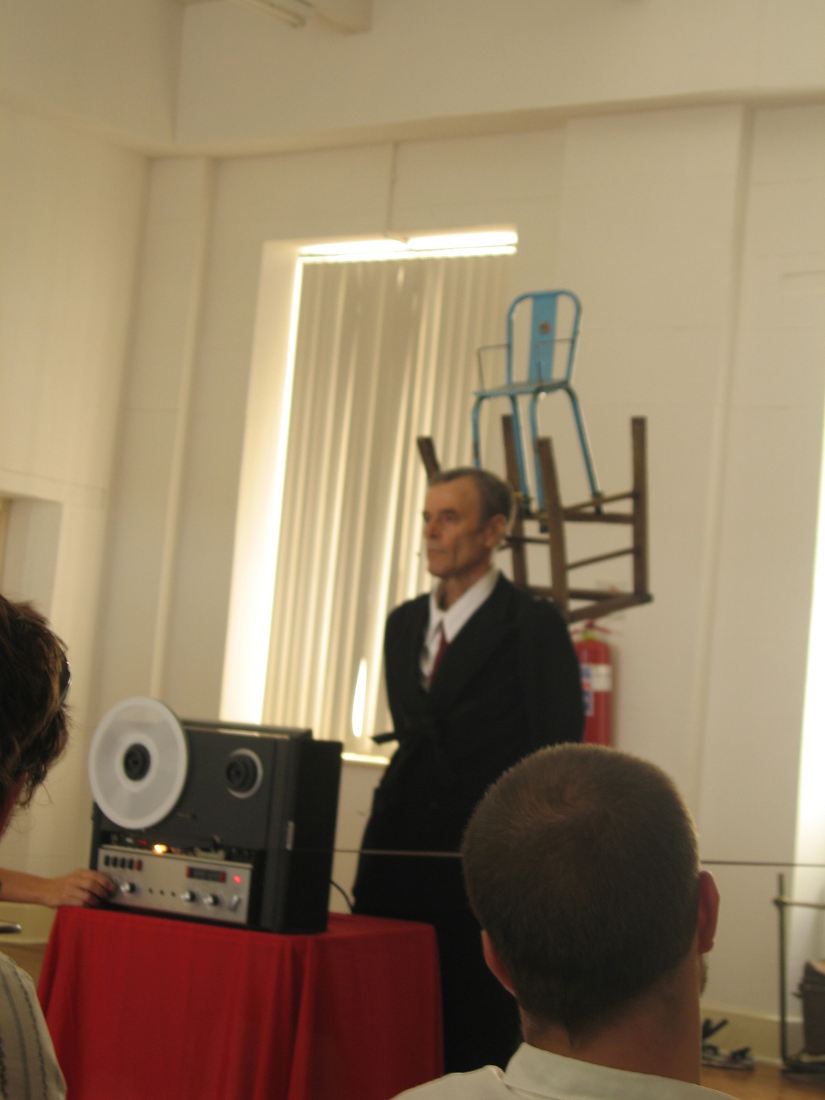 Almost immediately the demon of live performance struck: no sound. The ancient reel-to-reel was not working. We sorted something out, it kind of worked, but at low volume and with intermittent drop out. Ivor Powell – who wasn’t there, I cannot remember the reason but he had taken an elder statesman position against the notion of dada as a curatorial grab bag – would have loved the intrusion of chance and accident.
