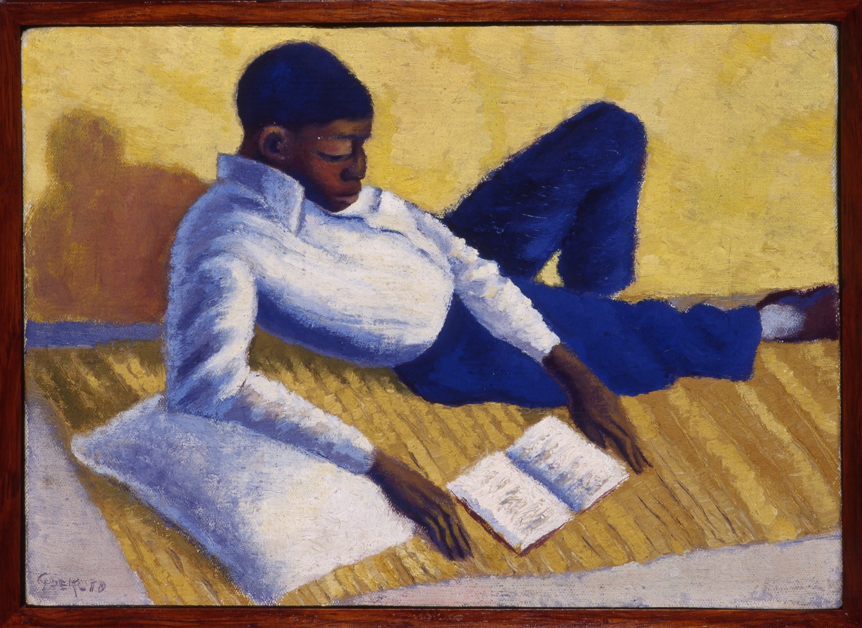 Though many of the people Sekoto painted lived in a country where they were considered second-class citizens, his paintings are resolutely without suffering. There is to his scenes a lightness so unlike the political heavy-handedness that would later come to characterise much social realism in South Africa. Sekoto, in the words of his friend and fellow artist, John Koenakeefe Mohl, “could paint our people, our life, our way of living, not speaking in the spirit of apartheid or submission.” While racial injustice and economic hardship shadowed black South African life, Sekoto’s vivid palette sought out moments of transitory joy and pleasure. Such is Portrait of a Young Man Reading, an image of quiet contentment.