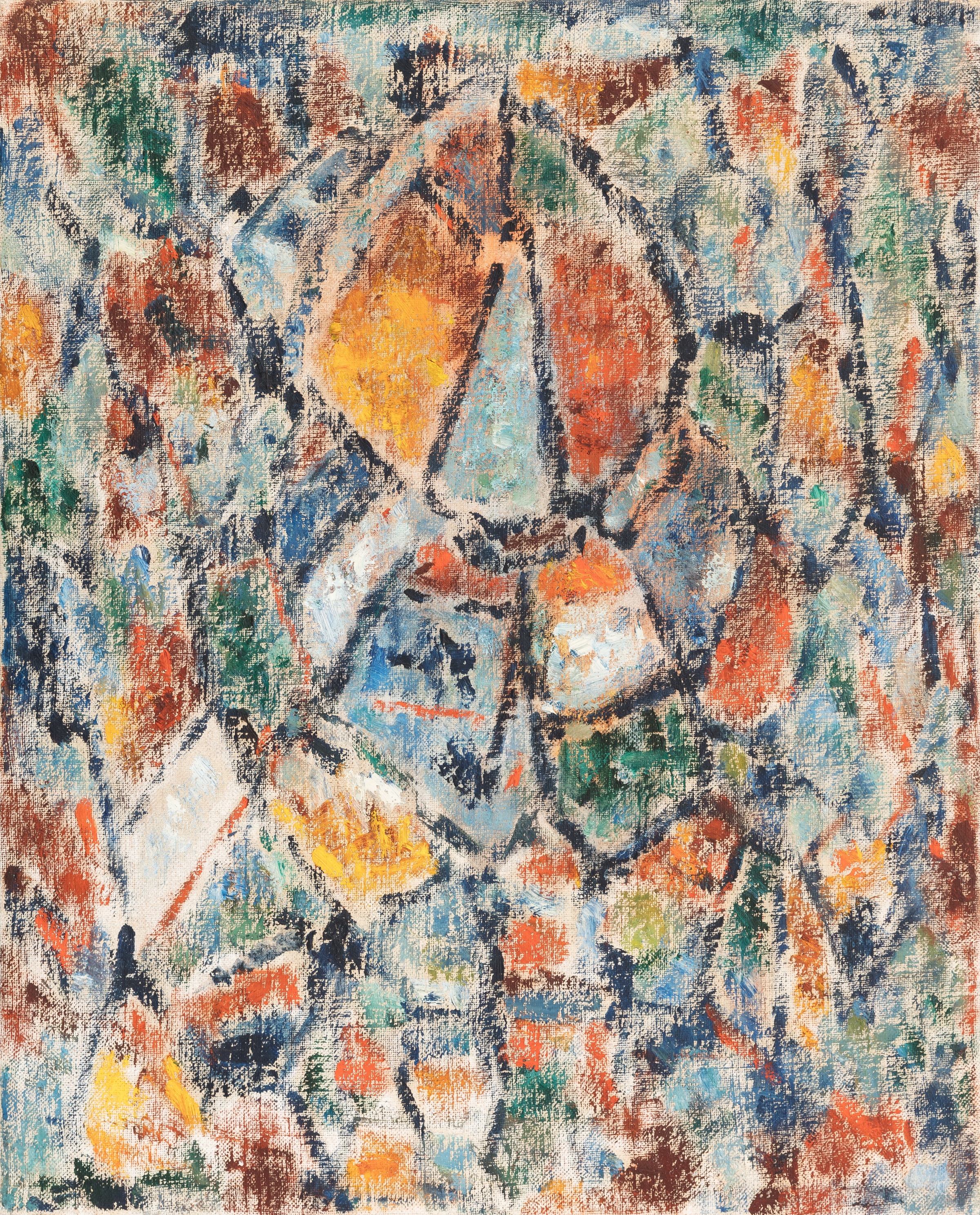 While many of Mancoba’s paintings, such as Untitled, first read as abstract compositions, most share the repetition of a single form. This form is at times clearly apparent; at others, it all but dissolves into the surrounding paint. The visual motif appears as a mask or emblematic totem – a face made of geometric shapes reflected along a vertical axis. Some suggest it is loosely based on West African Kota reliquary figures, others that it is a wholly imagined symbol. Over time, the mask grew increasingly indistinct in the artist’s paintings. In continuing to reduce this totemic image until it all but disappeared, Mancoba sought the essence of its form. “At a certain moment,” he said, “one wants to have the emotional experiences instinctively expressed and not insisted upon.”