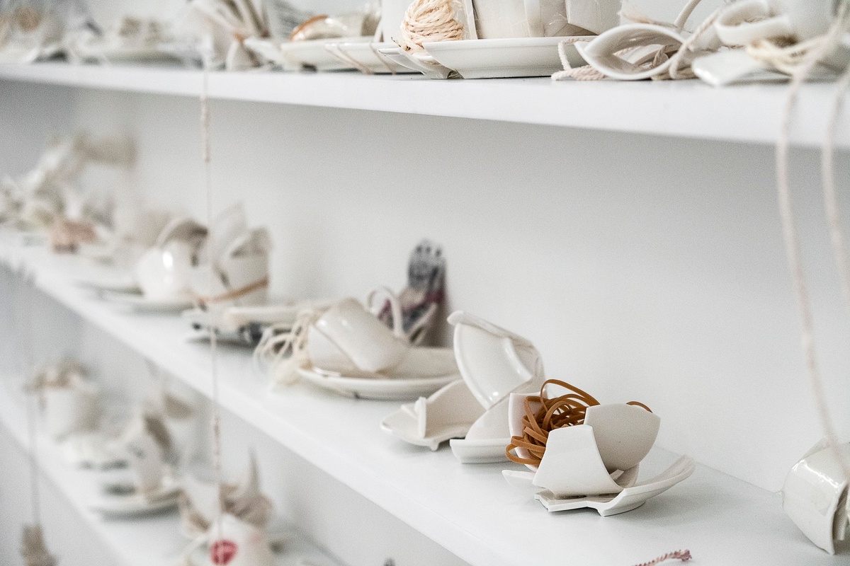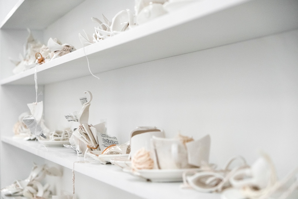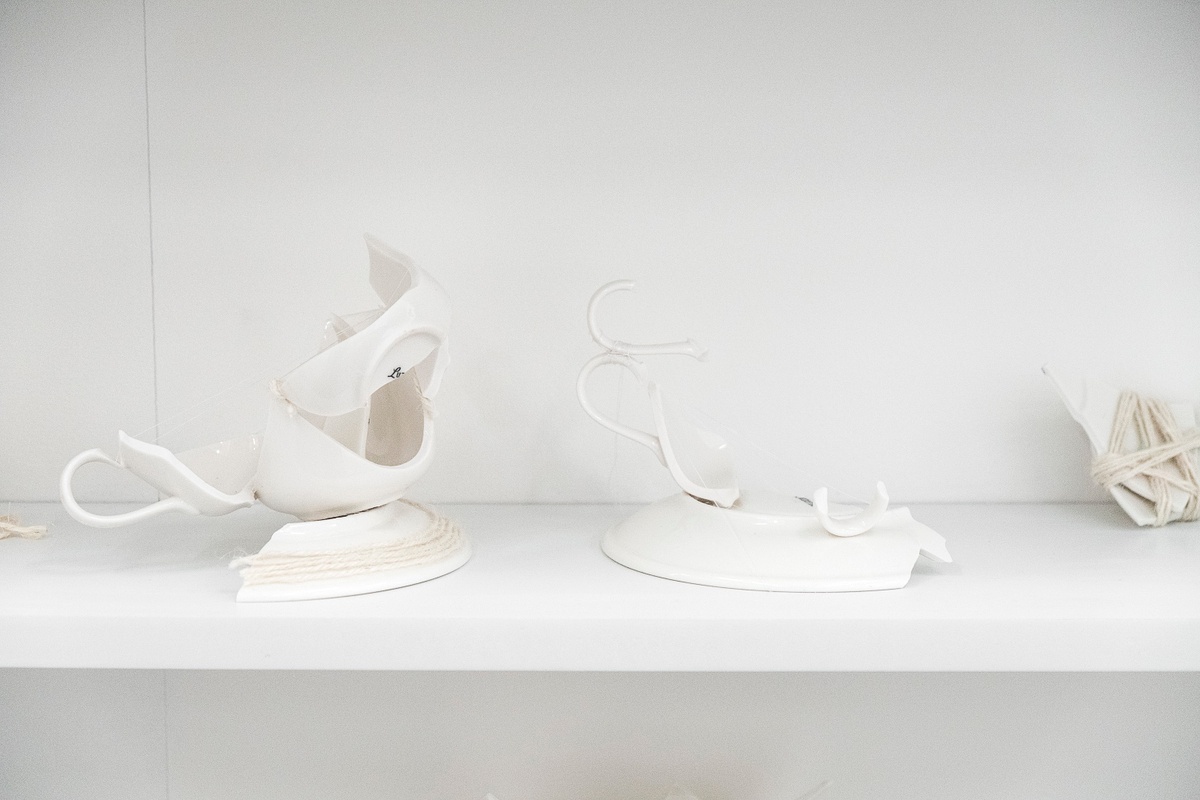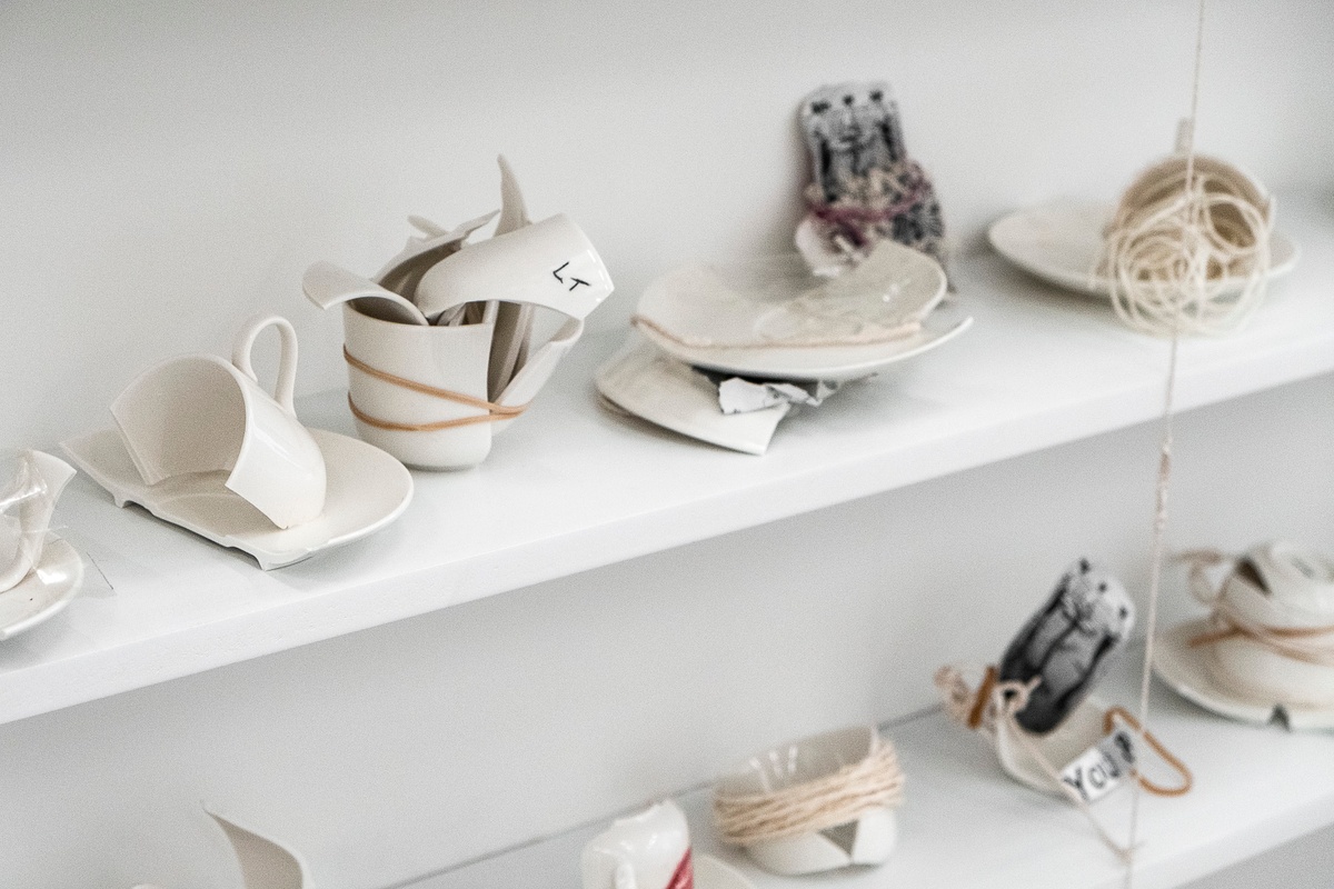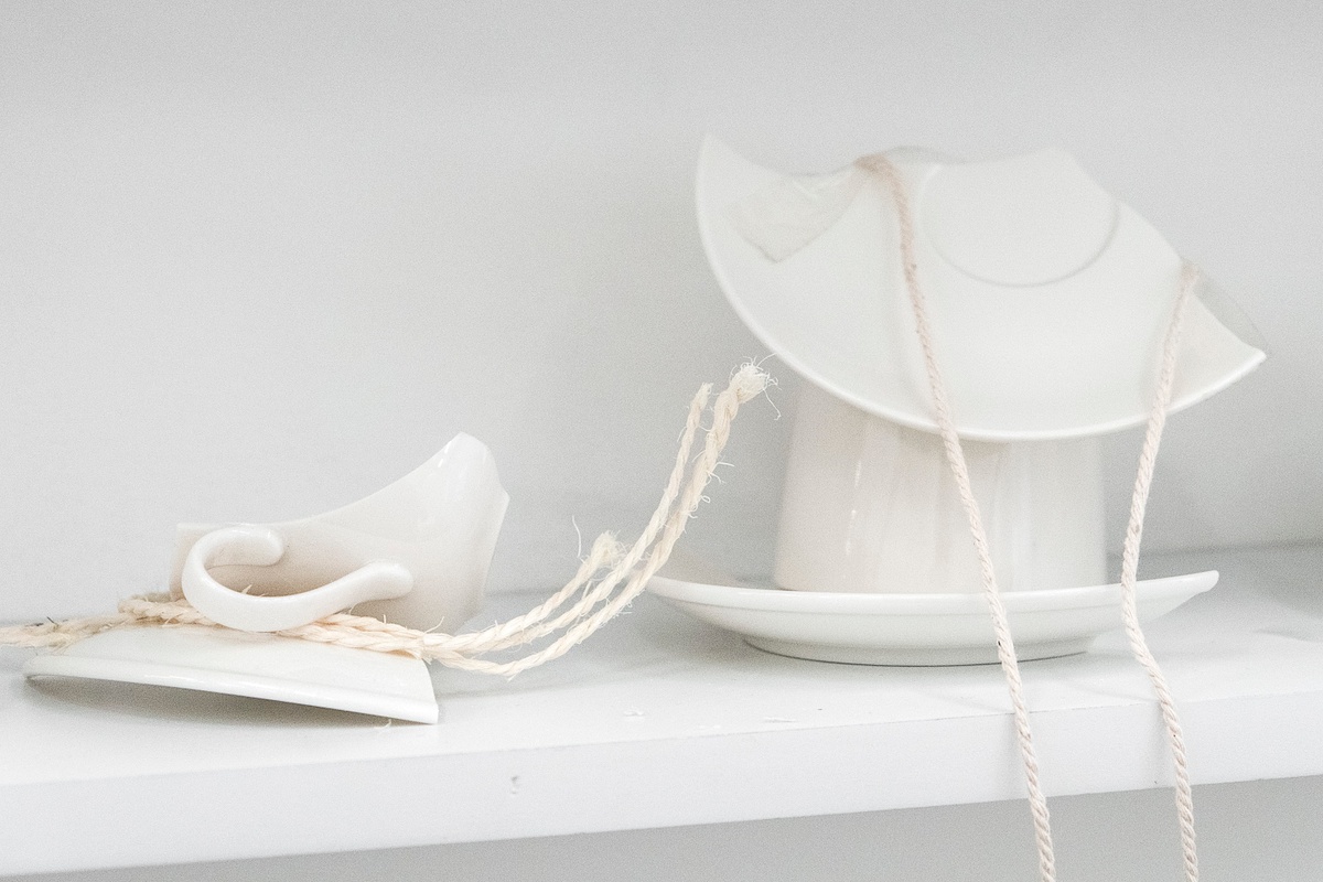 Accompanying the poem, a list of materials and supplies – in summary, ten wooden chairs that have been painted white, a white wooden table, broken cups and saucers, twine, glue, all-purpose adhesive, thread and scissors, and shelves. The work emerges as the exhibition in which it appears unfolds, where visitors are invited to ‘mend’ the crockery. Any attempt to fix a cup or saucer is thwarted by the volume of the porcelain pieces, the extent of their brokenness. Meditating on Ono’s prompt, visitors instead find themselves making anew. Small sculptures emerge from the materials at hand, where invention becomes its own form of repair.