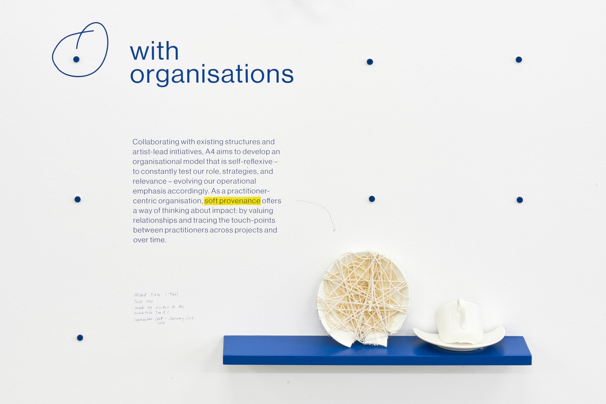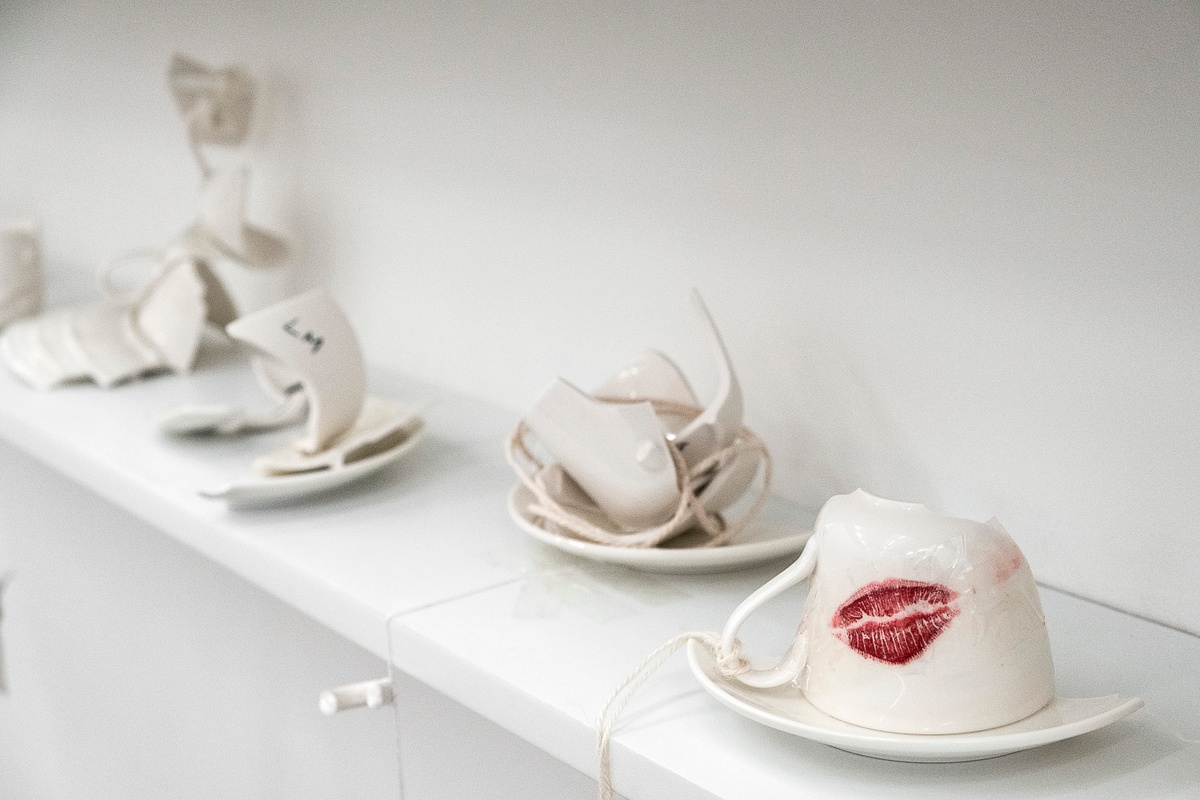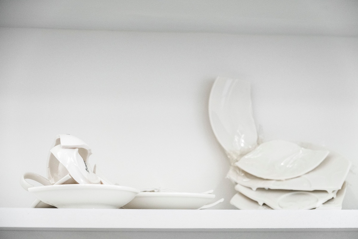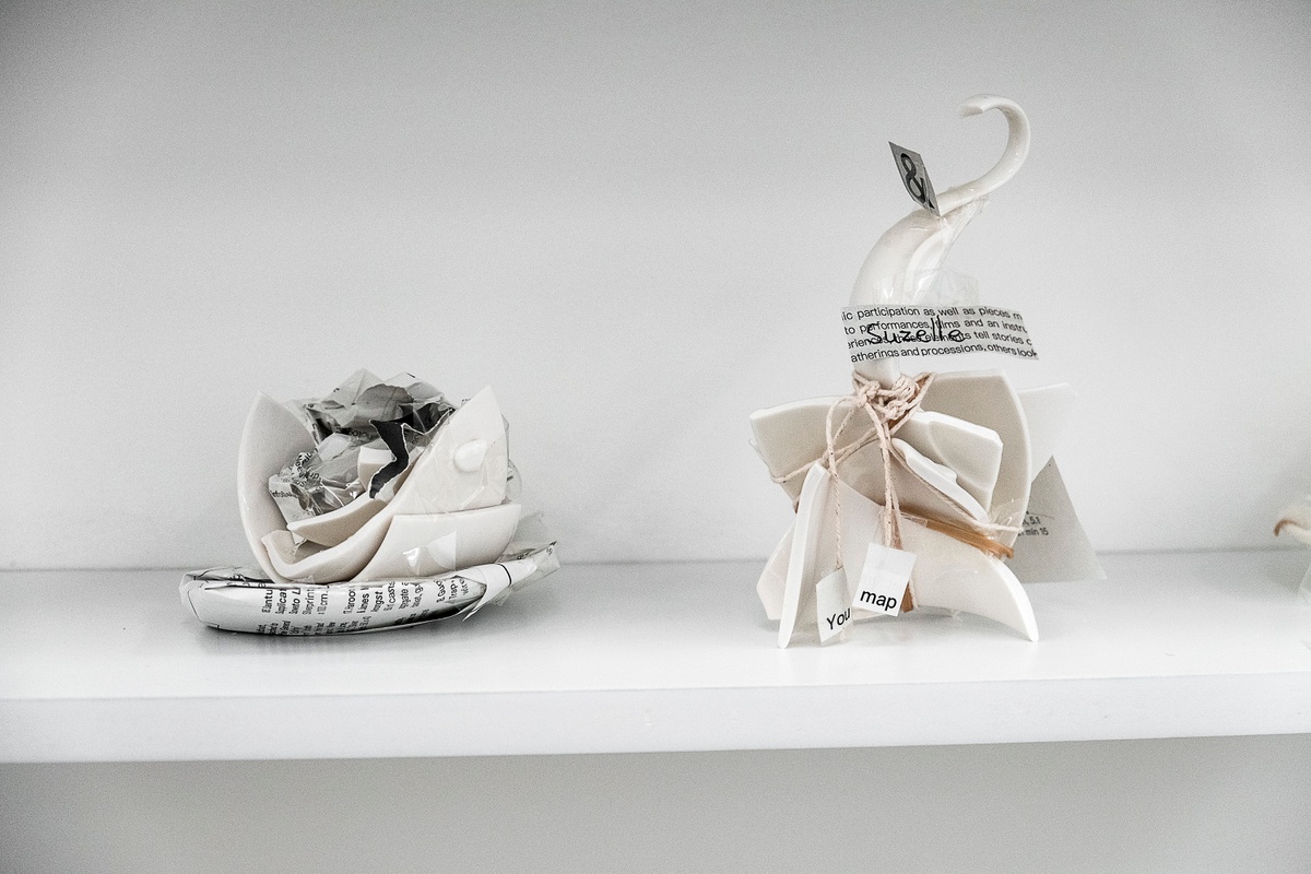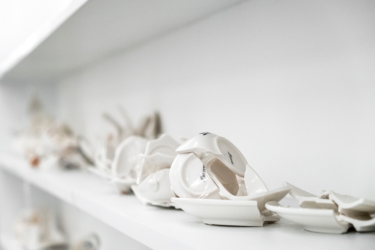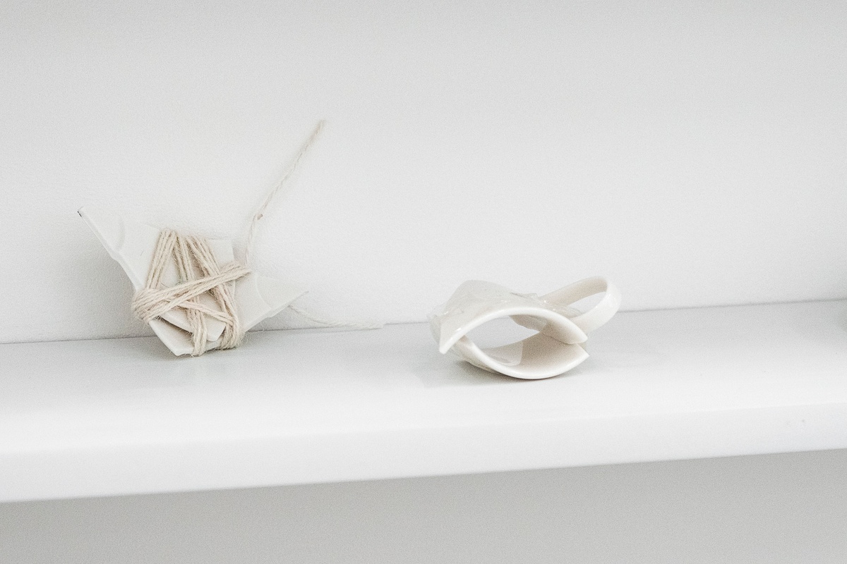 Accompanying the poem, a list of materials and supplies – in summary, ten wooden chairs that have been painted white, a white wooden table, broken cups and saucers, twine, glue, all-purpose adhesive, thread and scissors, and shelves. The work emerges as the exhibition in which it appears unfolds, where visitors are invited to ‘mend’ the crockery. Any attempt to fix a cup or saucer is thwarted by the volume of the porcelain pieces, the extent of their brokenness. Meditating on Ono’s prompt, visitors instead find themselves making anew. Small sculptures emerge from the materials at hand, where invention becomes its own form of repair.