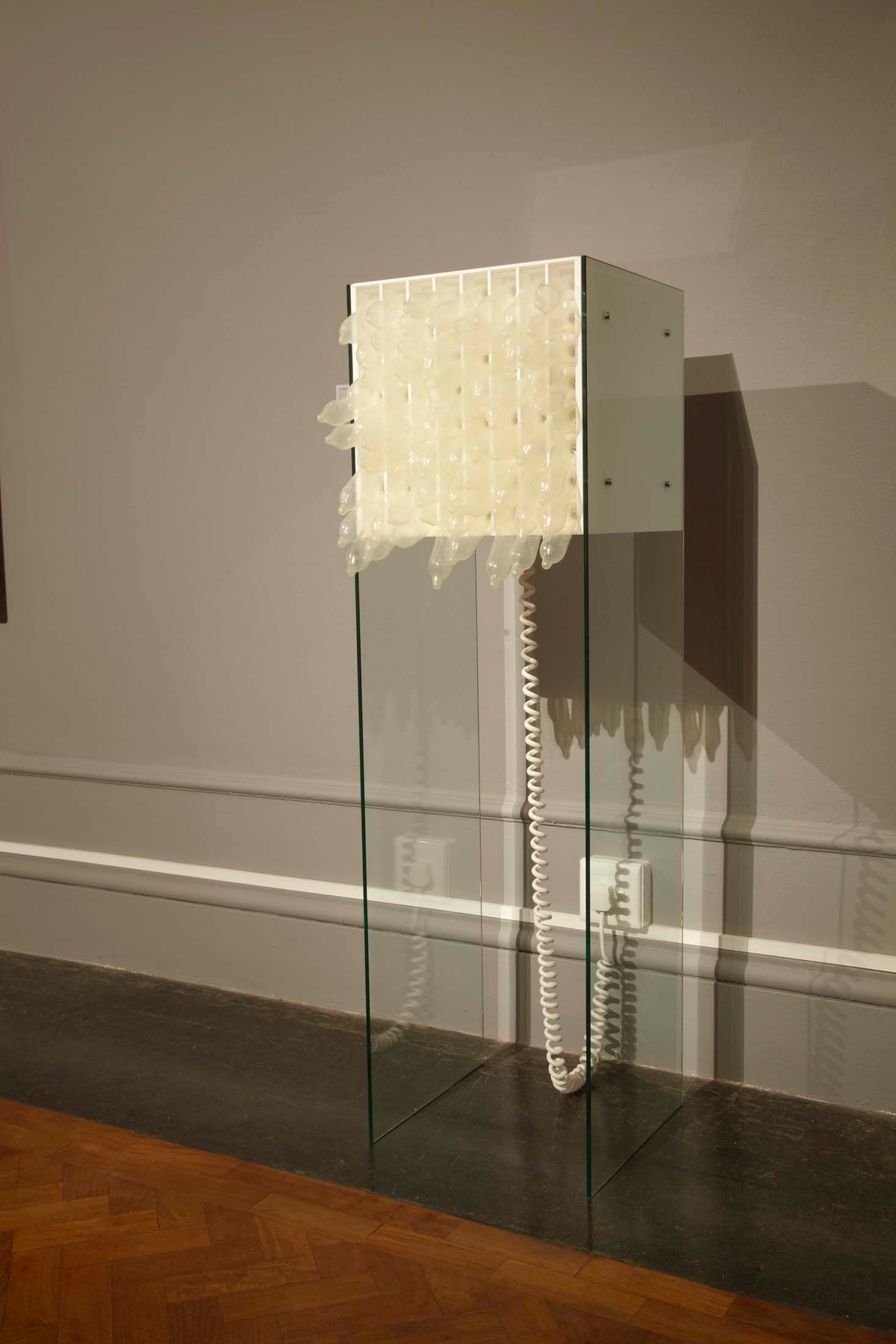 Artwork: John Nankin, BOX (1967/1975/2009). Perspex sheet and rod, glass, latex condoms, silicone teats, silicone tubing, pump and timer. 150 x 42.5 x 41.5 cm. Artwork courtesy of the artist. Image © Sebastian Voigt.