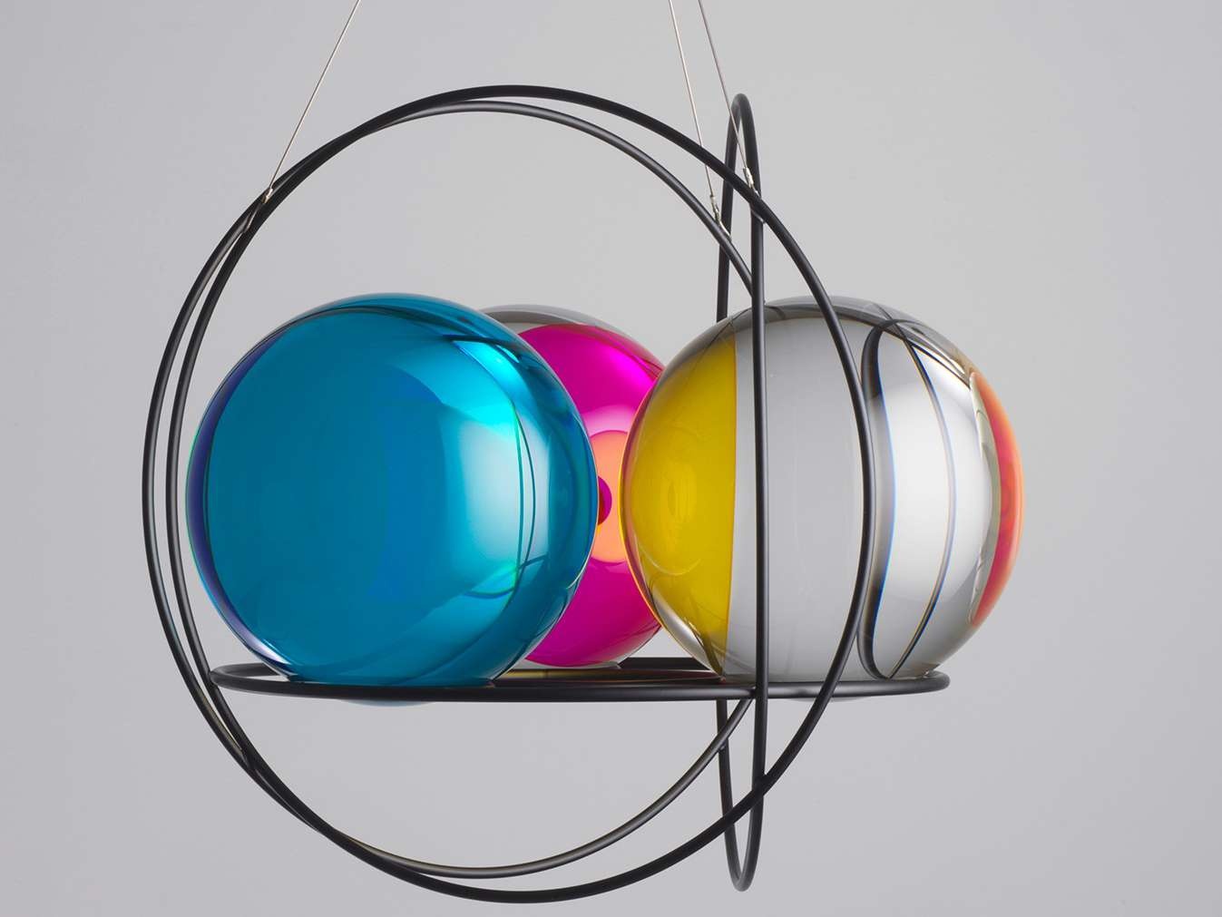 Reimagining reflection as a sculptural mechanism, Eliasson expands visual space, pairing the real world with its mirror image. He applies refraction to great effect, bending and reflecting light to make apparent its physical qualities. In Analogue accelerator, mirrors magnify light’s primary colours – cyan, magenta, and yellow – in a composition comprising three glass spheres balanced on circular metal structures. The work optically mixes these colours as it turns, filling each glass sphere with changing tones. Rotating on a single axis, the sculpture gives to light and colour a form, expressing with elegant minimalism the intangible nature of the visible.