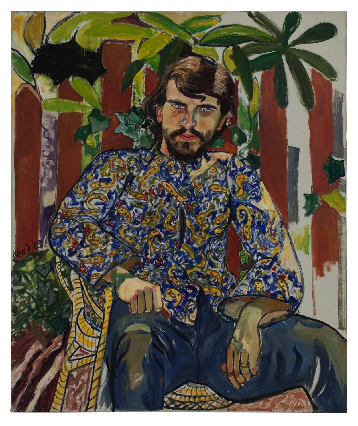 Neel painted her portraits from life, engaging her sitters in long conversations as she worked. She had little time for backgrounds, describing the surrounding scene in only a few loose brushmarks. What most preoccupied her was capturing the sense of a person rather than their semblance. She did not consider herself a realist (nor did she call herself an expressionist). Instead, she was visionary, pushing portraiture to its more radical, human potential. According to art critic Deborah Solomon, her momentary connection with her sitters “was so intense she claimed to feel newly desolate every time she completed a portrait.” Algis Alkaitis is a portrait of a friend of the artist’s son, Hartley. Though Neel did not know Alkaitis well, her painting evokes an understanding that extends beyond mere likeness.