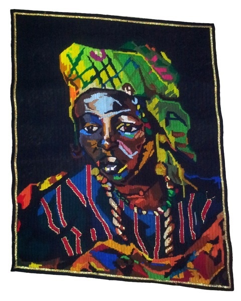 Dakar Woman belongs to a series of Ruga’s early tapestries, each based on a painting by the mid-century South African artist Irma Stern. Translating her images from oil to thread, Ruga reclaims Stern’s portraits of exoticised subjects. His is a gesture of re-appropriation, shifting an image from a colonial frame to a contemporary South African context. Removing the work from its historical canvas, Ruga not only invites the viewer to see the same image anew but welcomes the pictured figure into his narrative practice. That is, he welcomes the Dakar Woman into his Azania, a kingdom ruled – in the artist’s words – by “a pantheon of ladies.”